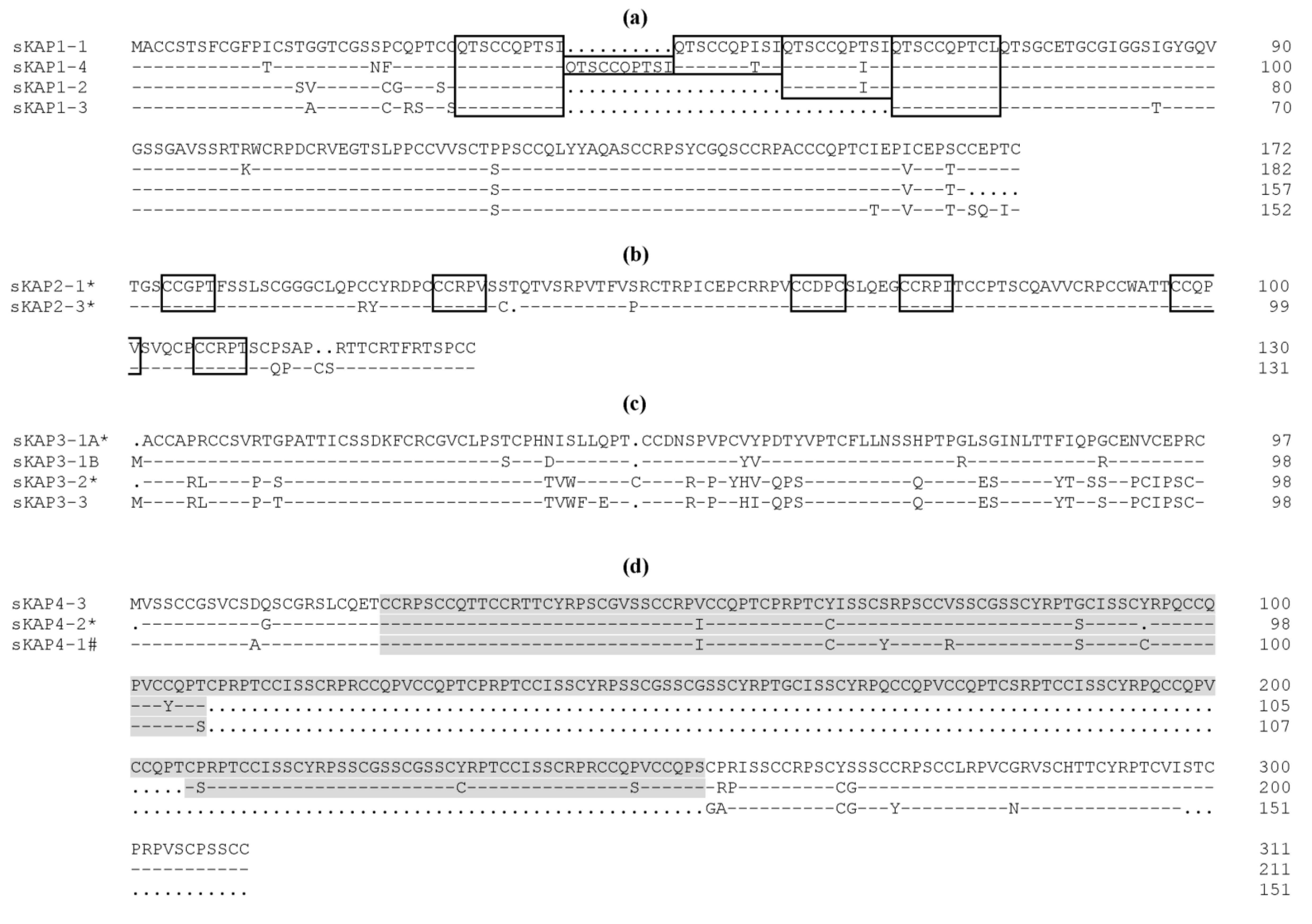 KAP1: KAP1 is a HS-KAP family that contains four members (KAP1-1, KAP1-2, KAP1-3 and KAP1-4) [13,14,19,29]. The number of members equals that described in humans [8,40]. The KAP1 family members are similar to each other and differ mainly in the number of conserved tandem decapeptide “QTSCCQPXXX” repeats in the N-terminal half of the proteins (Figure 1a). There are between three to five decapeptide repeats in KAP1-1 [41], whereas KAP1-2, KAP1-3 and KAP1-4 have three, two and five repeats, respectively [29,42,43]. There is an apparent loss of a five residue C-terminus tail in KAP1-2, compared to the other KAP1 proteins [29] and KAP1-1 and KAP1-4 are acidic KAPs, while KAP1-2 and KAP1-3 are neutral (Table 1).
