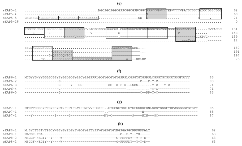 Electrophoretic analyses of the SCMK-Bs revealed that a large number of KAPs existed [5]. Seven KAPs with a high sulphur content (B2A or KAP1-1, B2B or KAP1-2, B2C or KAP1-3, BIIIA3 or KAP2-n, BIIIB2 or KAP3-1, BIIIB3 or KAP3-3 and BIIIB4 or KAP3-3) were initially isolated from wool and their amino acid sequences were determined [9,10,11,12,13,14,15,16] and two KAPs with a high glycine-tyrosine content were also isolated and characterised [17,18].