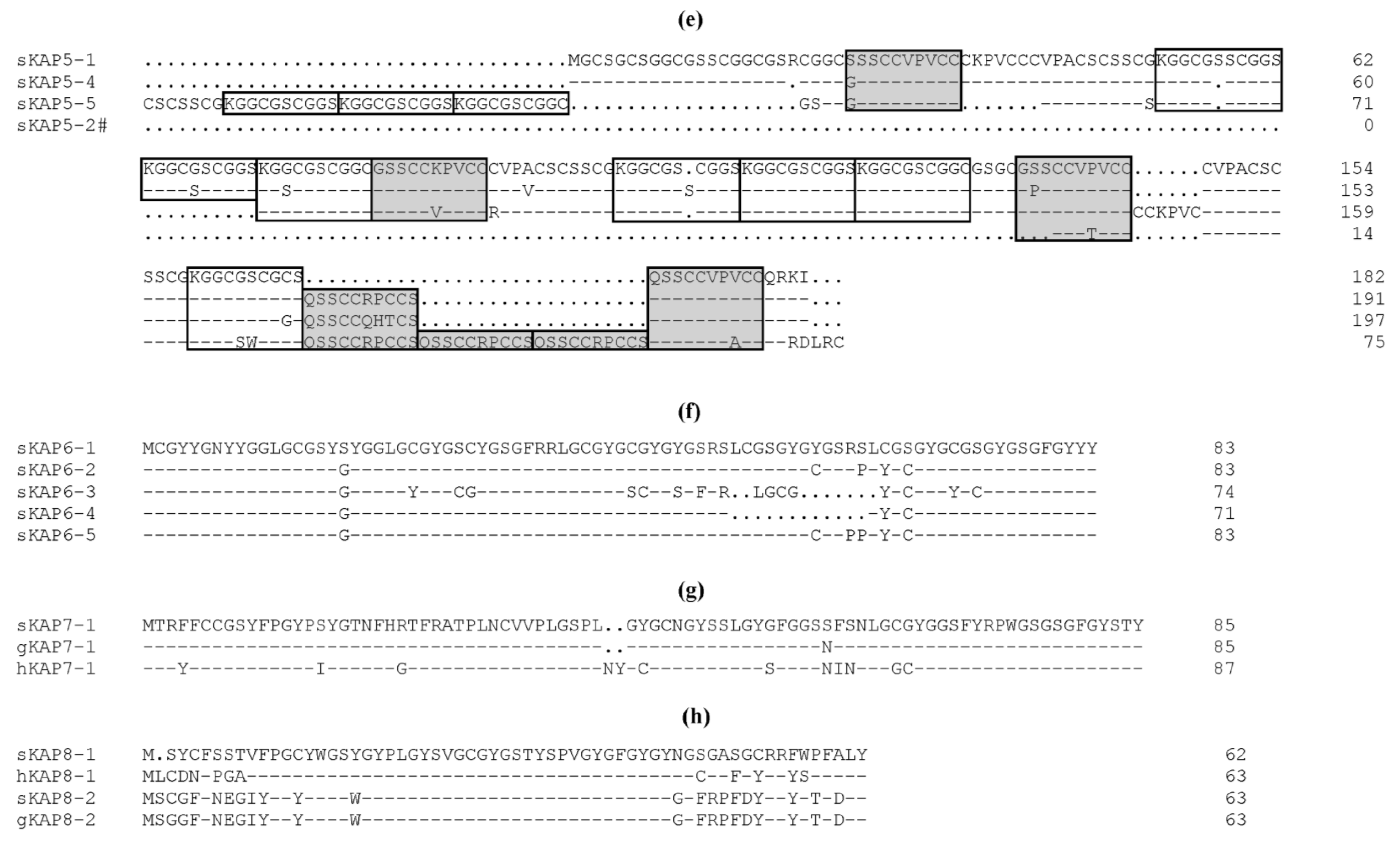 KAP8: KAP8 is a HGT-KAP family. In sheep, it was thought to contain only one member [25], but another potential member called KAP8-2 [33] has recently been identified. In humans only one KAP8 gene has been identified [45]. KAP8 proteins exhibit high sequence similarity across species, but have fewer glycine-tyrosine repeat structures when compared to the KAP6 family (Figure 1h). KAP8-2 contains a high content (4.8 mol%) of aspartic acid and glutamic acid, which is not common in other HGT-KAPs, and hence it has a low pI value of 6.3 [33]. In sheep, KAP8-1 is weakly basic, while KAP8-2 is weakly acidic (Table 1).