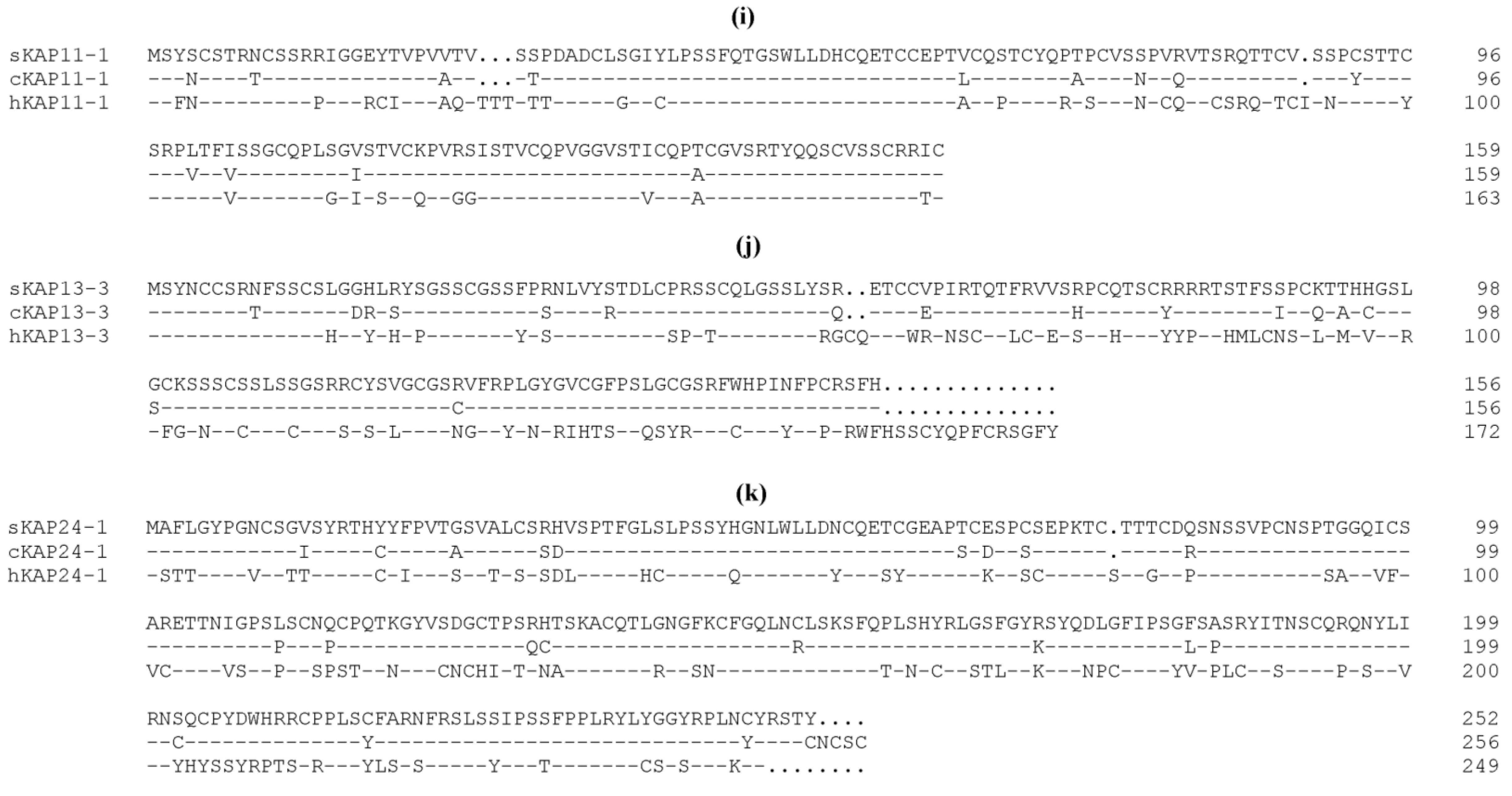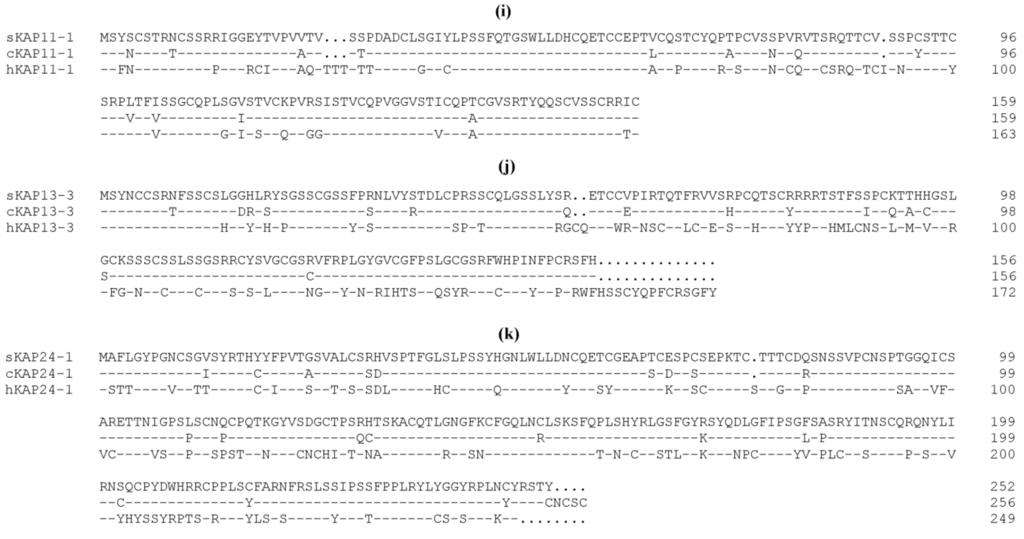 KAP24: There is only one member (KAP24-1) reported in sheep [30] and in humans [38]. While probably belonging to the HS group, the KAP24-1 protein contains a moderate level of cysteine, but a high content of serine and tyrosine. High tyrosine contents are typically not observed in other HS or UHS KAPs and additionally, the tyrosine in KAP24-1 is not part of the dimeric glycine-tyrosine repeats that are found in other high glycine-tyrosine KAPs [30]. Wool KAP24-1 is a basic protein (Table 1) and it has a low (~64%) sequence similarity to the human orthologue. The human KAP24-1 protein possesses a series of tandem decameric repeat structures at the C-terminal end [38], but similar structures are not obvious in the ovine KAP24-1 sequence (Figure 1k).