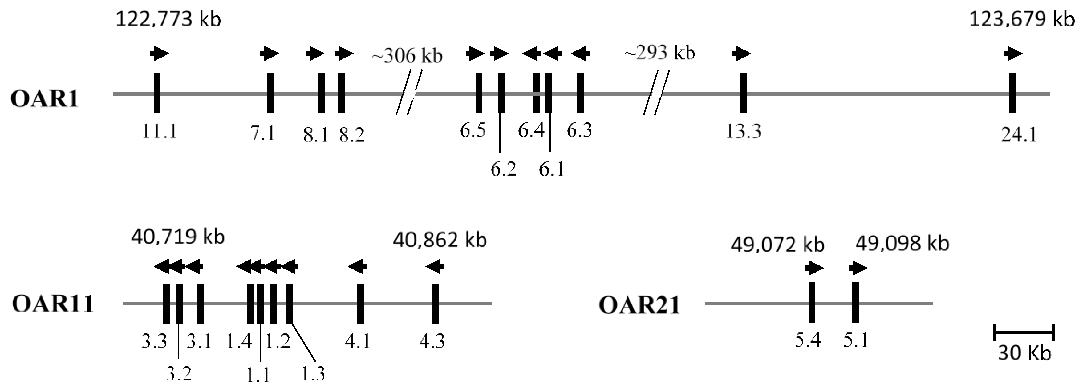Clustering of the ovine KAP genes in three chromosome regions. The bolded vertical bars represent known KAP genes and the arrows indicate the direction of transcription. The numbers below these bars are the KAP gene names (i.e., 11.1 refers to KRTAP11-1). The spacing of the genes is only approximate and is based on the Ovine Genome Sequence Assembly v4.0 sequence, where coordinates are given for the boundaries of the clusters, based on the first and last gene identified in the group.