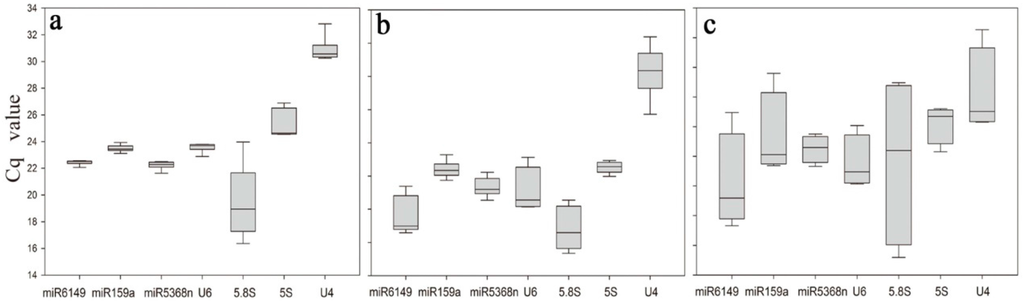 Under the various experimental conditions, the expression levels of the seven candidate reference genes displayed quite different quantification cycle (Cq) values, spanning 16.37–30.82 (Figure 1a, Table S2). 5.8S rRNA was the least expressed gene with the lowest mean Cq value (16.37), and U4 had the highest mean Cq value (30.82). 5.8S rRNA showed the most variation in expression levels when both biological variation and experimental conditions were considered, as shown in Figure 1, even when amplified from a 100-fold dilution of cDNA reverse transcribed from 100 ng total RNA. Its lowest Cq value was under ABA treatment (16.37) and the highest Cq value was for the non-treatment sample (23.97), representing almost seven cycles of difference in Cq values. In contrast, miR6149 and miR159a were very stable candidate reference genes, with Cq values spanning 22.06–22.56 and 23.12–23.94, respectively, among different treatment samples.