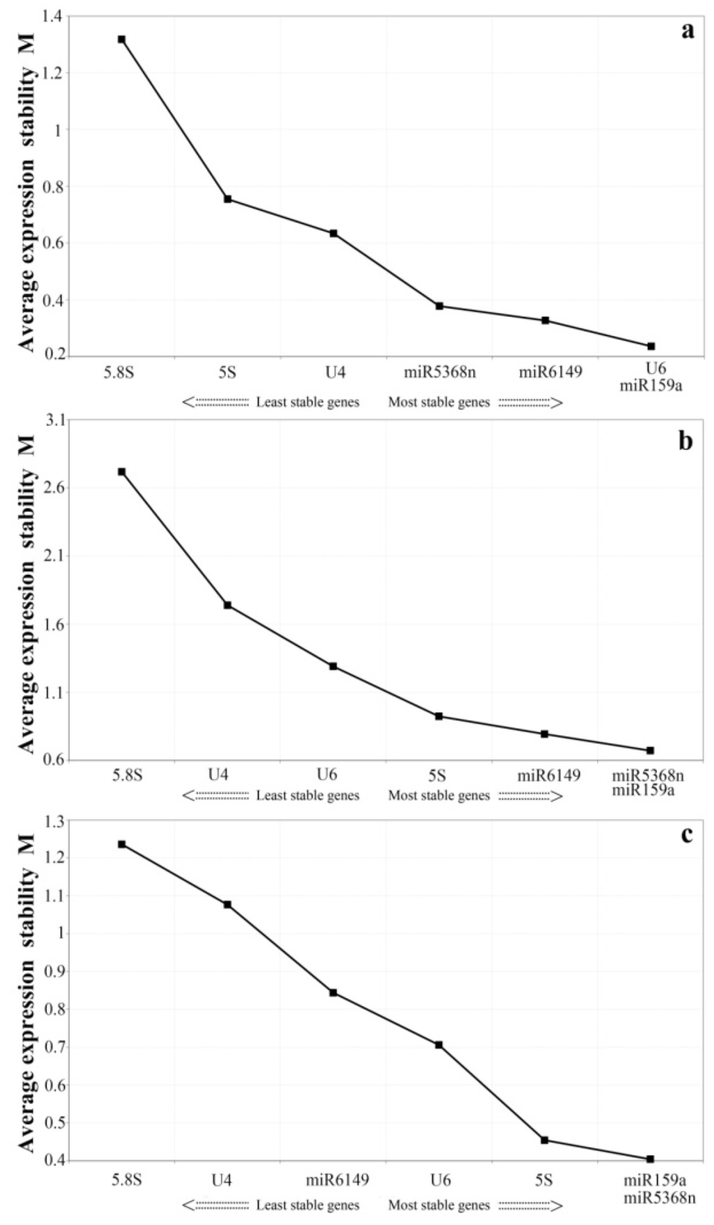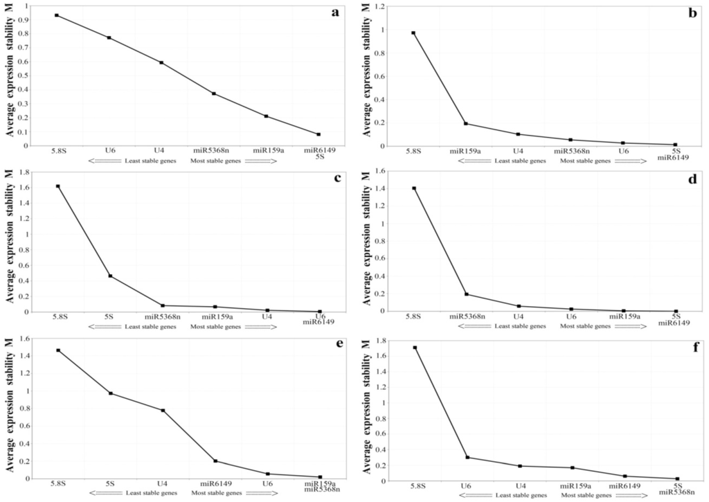 In order to minimize bias, we selected the two different statistical analysis tools, geNorm and Normfinder, to calculate the expression stability of all the candidate reference genes. The geNorm program recommends the use of candidate reference genes with an average expression stability value, M, below the threshold of 1.5. A lower value of M shows more stable gene expression [40]. Candidate genes ranked by M value are shown in Figure 2. Here, all candidate genes showed stable expression in the two sample groups (the bud to the fifth leaf, and various treatments), each having an M value lower than 1.4 (Figure 2a,c). As shown in Figure 2b, in different tissues, the M values of U6,miR5368n, and 5S rRNA were lower than those of the other candidate genes, indicating that they are the most stably expressed genes according to geNorm, while miR159a, miR6149 ,U4 and 5.8S rRNA had an M value over 1.5 and are thus likely to be too untable to use as reference genes. For the samples of the bud to the fifth leaf, the three top-ranked candidates were miR159a, miR5368n and 5S rRNA. Under the biotic and abiotic stresses, the three most stably expressed genes were miR159a, miR6149 and U6.
