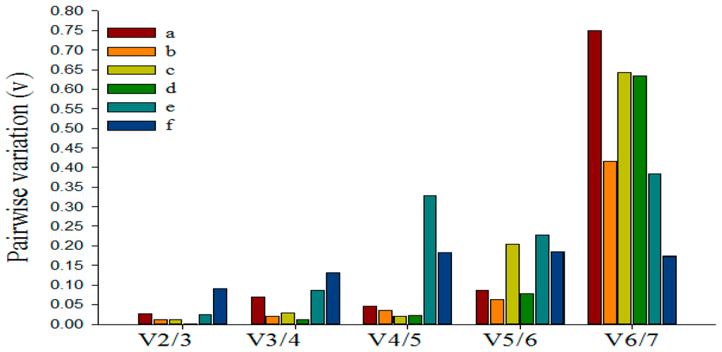Previous researches have shown that using multiple reference genes as internal controls for normalization may generate more reliable results than using a single gene [40,46]. GeNorm software can be used to calculate the pairwise variation (Vn/Vn+1) between sequentially-added normalization factors to determine the optimal number of reference genes needed for accurate and reliable normalization [40]. The proposed cut-offvalue of Vn/Vn+1 is 0.15, below which the inclusion of an additional control gene is not required. As shown in Figure 4, for the six experimental samples, V2/3 valued 0.026, 0.012, 0.011, 0.002, 0.025 and 0.091, respectively, all of which were below the cut-off threshold of 0.15, demonstrating that the optimal reference pair in each group was the best choice of multiple reference genes (Figure 3). Therefore, we could consider miR6149 and 5S rRNA as the optimal multiple reference genes for the tea plant leaves treated by Ectropis oblique attack and SA, respectively, for the bud to the second leaf sample, U6 and miR6149 as optimal for the leaves damaged by mechanical wounding, and miR5368n and 5S as the best multiple reference genes for the leaves treated by MeJA, while miR5368n and miR159a were optimal for the leaves treated by ABA.