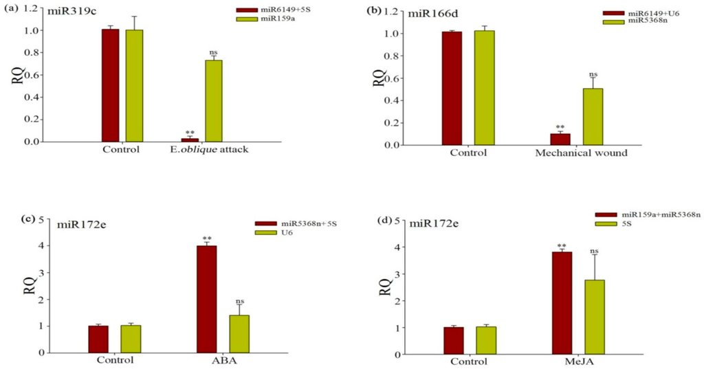 Evaluation of reference gene performance when normalizing target genes under experimental conditions. (a) Relative expression levels of miR319c in treated and non-treated plants, under E. oblique attack; (b) Relative expression levels of miR166d under mechanical wounding; (c,d) Relative expression levels of miR172e under ABA and MeJA application, respectively. Candidate reference genes used to normalize miR319c were miR6149 and 5SrRNA—the most stable reference genes under E. oblique attack, and miR159a—the unstable reference gene under E. oblique attack. Candidate reference genes used to normalize miR166d were miR6149 and U6—the most stable reference genes under mechanical wounding, and miR5368n—the most unstable reference gene under mechanical wounding. Candidate reference genes used to normalize miR172e were miR5368n and 5SrRNA—the most stable genes under ABA treatments, and U6—the most unstable gene under ABA treatments. Candidate reference genes used to normalize miR172e were miR5368n and miR159a—the most stable genes in MeJA treatments, and 5SrRNA—the most unstable gene under MeJA treatments. Asterisks (**) indicate very significant difference between the treated and non-treated plants, and no significance (ns) indicates no significant difference, based on a t-test (p < 0.01).