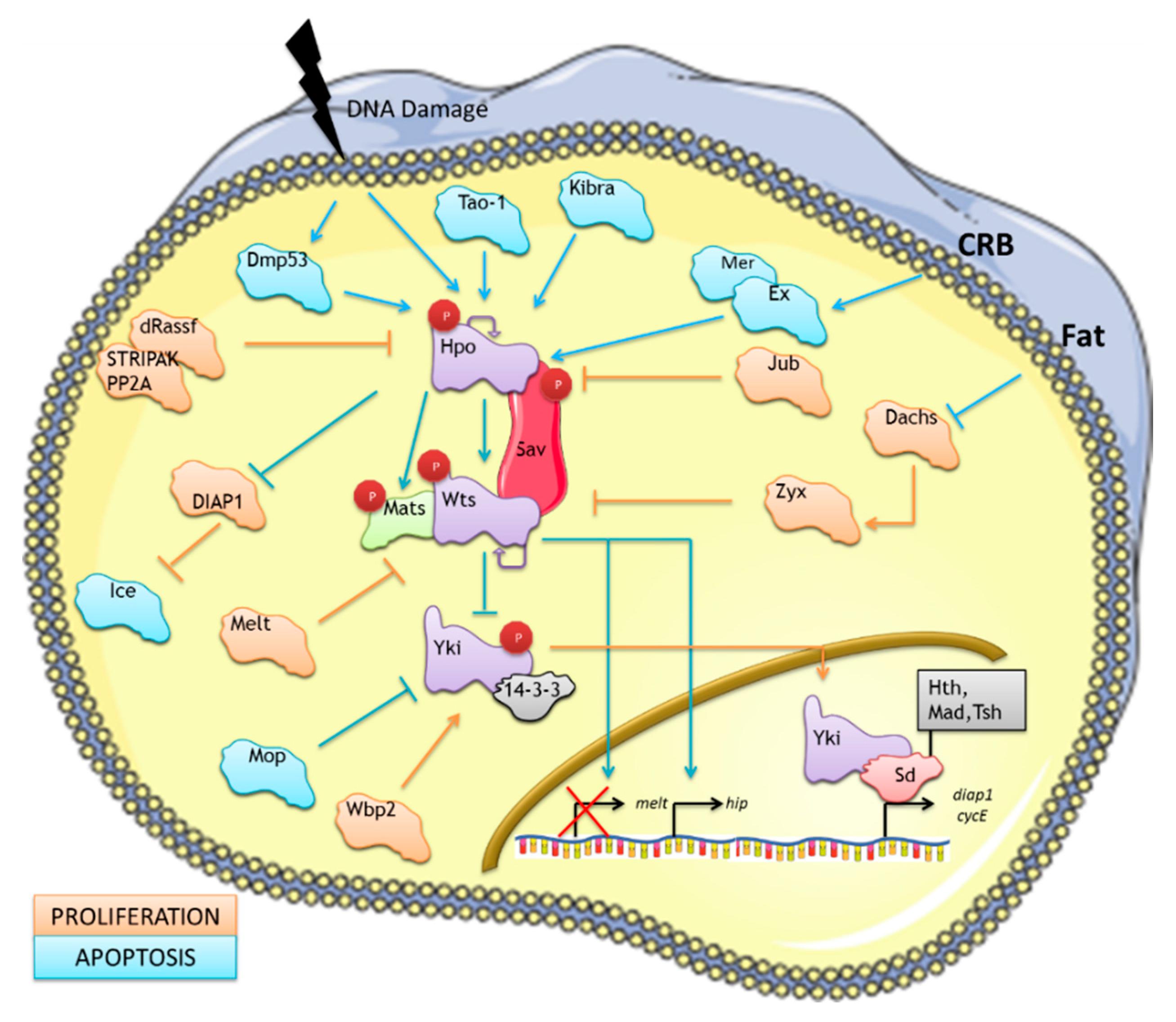 The first articles that described the role of the proteins indicated that the involvement of the Hippo proteins in the activation of apoptosis might be more intricate. In particular, active Hpo was shown to promote the transcription of the pro-apoptotic gene Head involution defective (Hip) resulting in the activation of apoptosis [51]. Intriguingly, Harvey et al. showed that Hpo could phosphorylate DIAP in vitro and proposed it regulates DIAP protein levels by direct phosphorylation which induces ubiquitination dependent degradation [52]. Contemporary work from Pantalacci et al. also came to similar conclusions [53]. The work from this group showed that Hpo can also regulate cell death by direct phosphorylation of DIAP1 which would promote apoptosis by decreasing the protein level of DIAP1. Importantly, this work strongly indicated that this function of Hpo was independent of Wts. Finally, the authors also showed that in order to facilitate the association between Hpo and its binding partner Wts, Hpo is able to promote the phosphorylation and stabilisation of the tumour suppressor scaffold protein Sav [53]. Therefore, this early work already indicated that different feedback loops regulate the pathway and determine cell fate in the fruit fly. Importantly, work from Tapon’s group showed that the Hippo pathway also participates in stress-induced responses. Hpo can be activated by ionizing radiations (IR) in a Dmp53-dependent manner. Further, Hpo is required for the cell death response elicited by IR or the ectopic expression of Dmp53 [54]. Finally, the Hippo pathway has been shown to regulate activation of apoptosis via Yki and Dmp53 which control the expression of the pro-apoptotic gene reaper [55] These works show a direct relation of proteins of the Drosophila pathway with Dmp53 one of the most important regulators of cell death that remarkably is also a downstream effector of LATS1/2 [28].