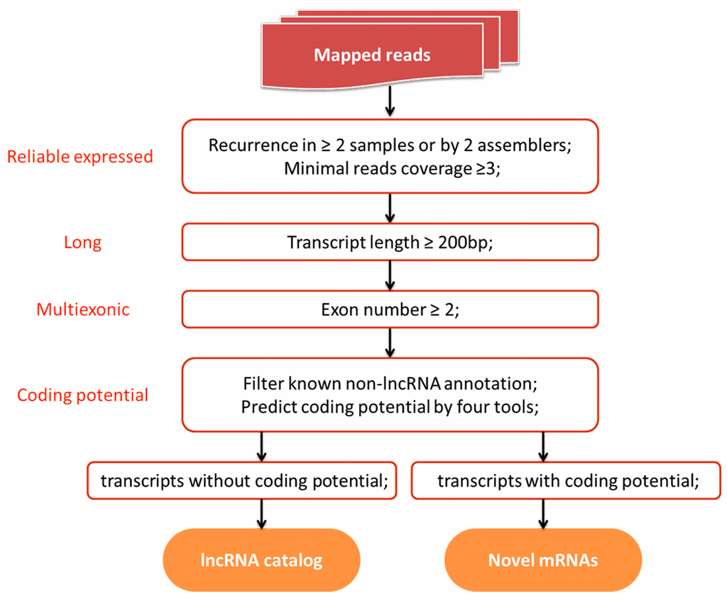 - CNCI v2 (score < 0) [23], CPC-0.9-r2 (score < 0) [24], Pfam-scan v1.3 (E-value < 0.001) [25], and PhyloCSF v20121028 (no sufficiently long ORFs found) [26] were used to evaluate the coding potential of transcripts. Transcripts revealing coding potential in any of the four tools were filtered out.