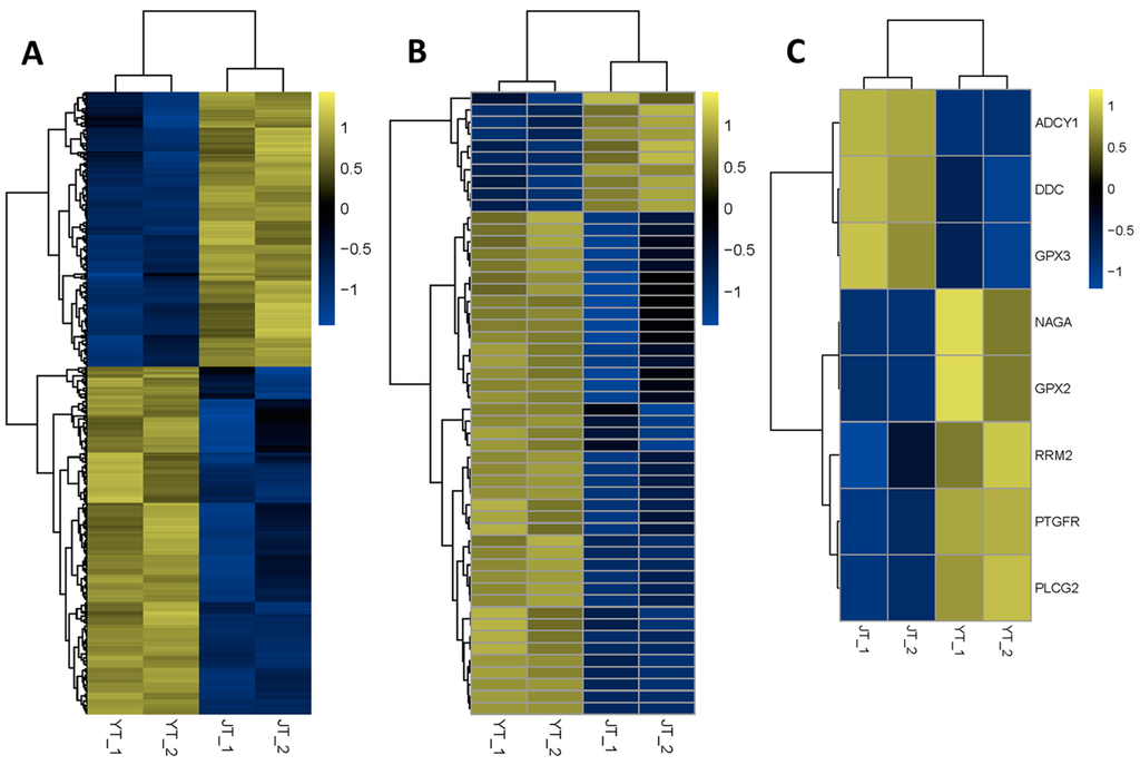Heat maps of the distinguishable expression profiles in the thyroid gland of Jinhua and Yorkshire pig breeds. (A) Hierarchical clustering of the differentially-expressed mRNAs; (B) Differentially-expressed lncRNA transcripts; and (C) TH-regulation-related genes is performed. Yellow indicates relatively high expression and blue denotes relatively low expression.