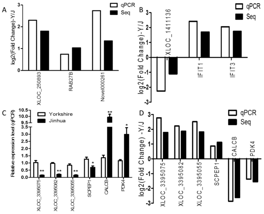 Validation of the RNA-seq data by qRT-PCR. (A) The expression patterns of XLOC_250893 and its target genes (RAB27B and Novel000261); and (B) for XLOC_1411136 and its target genes (IFIT1 and IFIT3) were verified by qRT-PCR; (C) The relative expression levels of six randomly selected genes were expressed as the mean ± SEM. * p < 0.05, ** p < 0.01; (D) Fold-change of the Yorkshire pigs versus the Jinhua pigs were verified by qPCR.