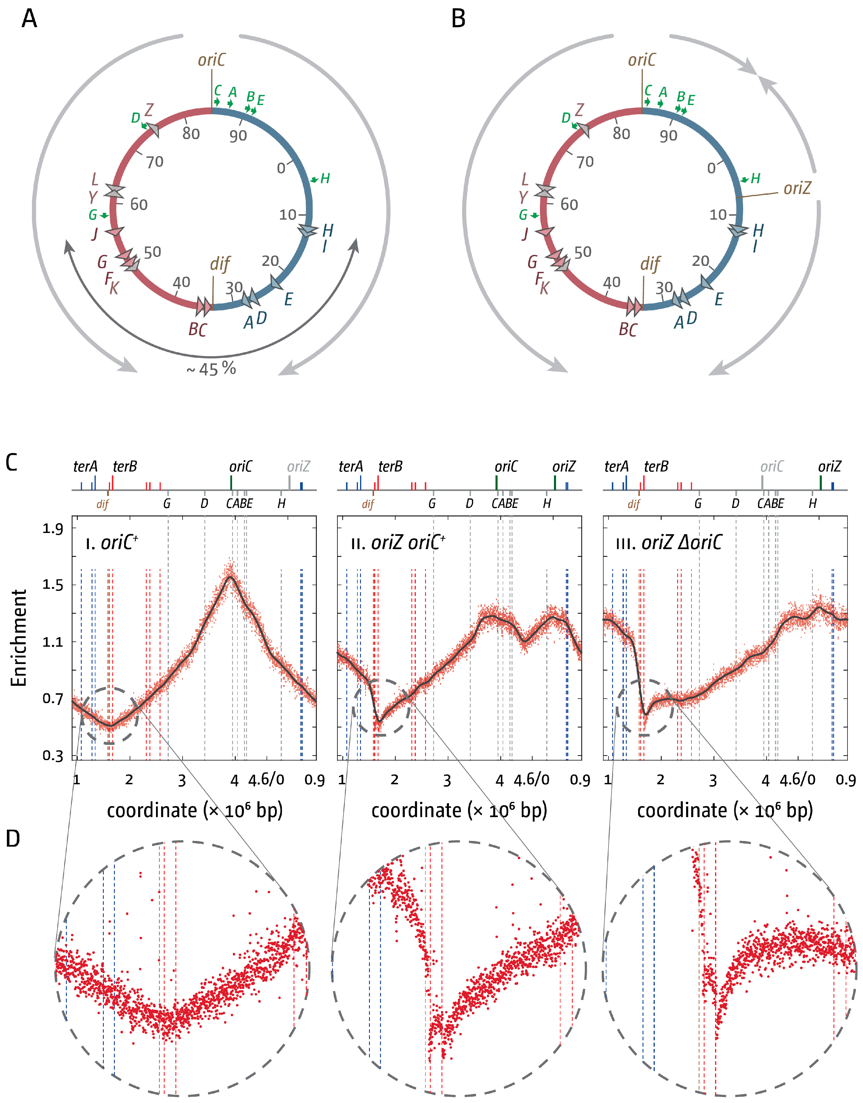 Replication fork fusion sites in E. coli cells with one and two replication origins. (A) Schematic representation of the replichore arrangement of the E. coli chromosomes. Direction of replication from the origins is indicated by grey arrows. The origin, oriC, and the dif chromosome dimer resolution sites are indicated. All ter sites are highlighted by triangles and identified by their corresponding letter (“A” indicates the terA site). The colour of the triangles corresponds with the replichore for which replication is permissive (ter sites highlighted in blue will block forks coming from the red replichore and vice versa). The secondary ter sites terK, L Y, and Z are shown in grey. Numbers represent the minutes of the standard genetic map (0–100 min). Green arrows represent location and direction of transcription of the 7 rrn operons A–E, G, and H; (B) Schematic representation of the replichore arrangement of the E. coli chromosome in cells with two replication origins. oriZ indicates the integration of a duplication of the oriC sequence near the lacZYA operon; (C) Marker frequency analysis of E. coli oriC+, oriC+ oriZ, and ∆oriC oriZ cells. The number of reads (normalised against reads for a stationary phase wild type control) is plotted against the chromosomal location. Note that the chromosomal location starts at 0.9 Mbp for a better visualisation of both replication origins. A schematic representation of the E. coli chromosome showing positions of oriC and oriZ (green line; grey if deleted/not present) and ter sites (above) as well as dif and rrn operons A–E, G, and H (below) is shown above the plotted data. The grey line shows a LOESS regression curve of the marker frequency data. Data are re-plotted from [10]; (D) Detail view of the native termination area of the E. coli chromosome. See text for details.