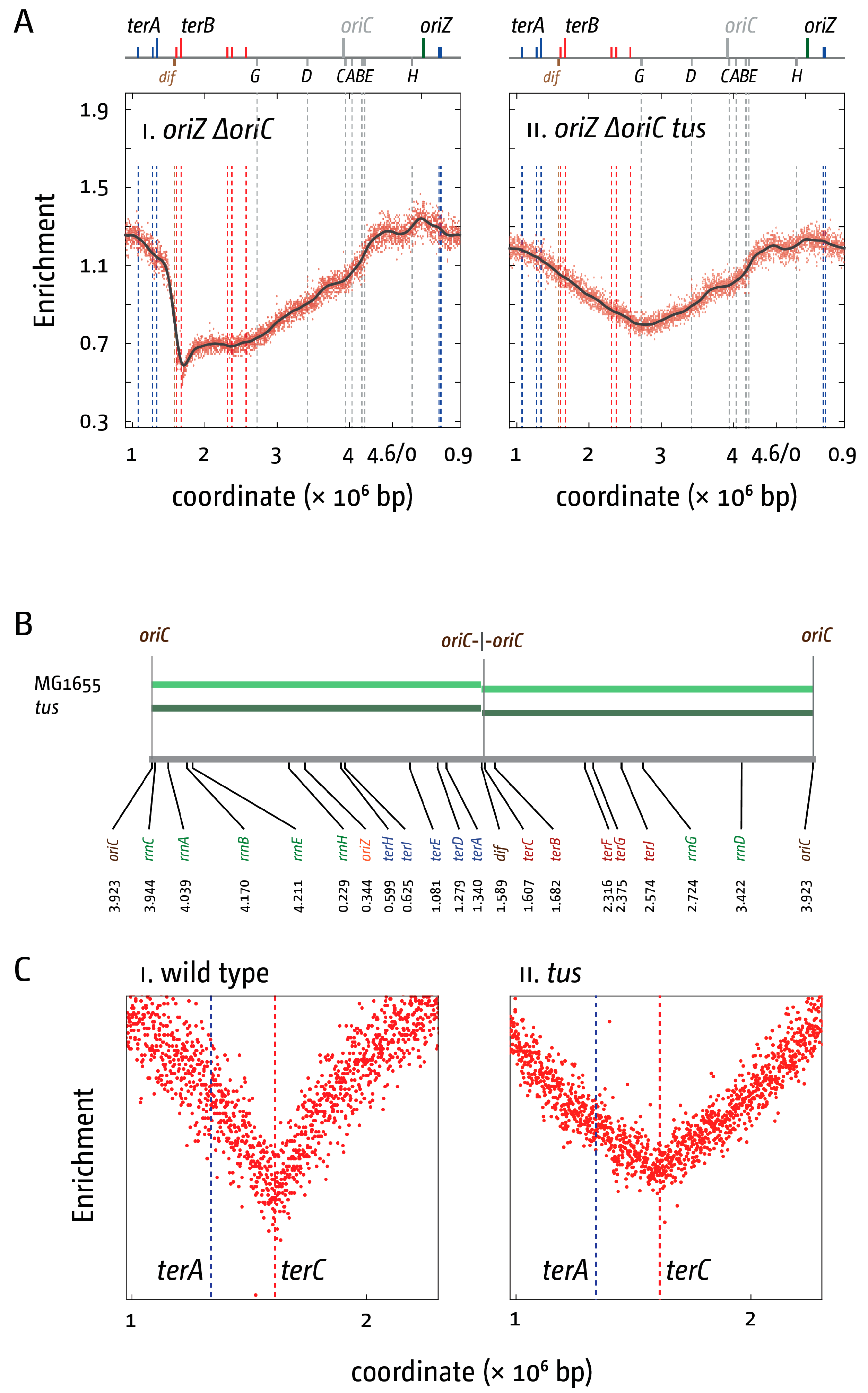 Replication termination in E. coli cells in the presence and absence of a functional replication fork trap. (A) Marker frequency analysis of E. coli ∆oriC oriZ cells in which the replication fork trap in the termination area was inactivated by deletion of the tus gene. The number of reads (normalised against reads for a stationary phase wild type control) is plotted against the chromosomal location, starting at 0.9 Mbp for a better visualisation of both replication origins. A schematic representation of the E. coli chromosome showing positions of oriC and oriZ (green line; grey if deleted/not present) and ter sites (above) as well as dif and rrn operons A–E, G, and H (below) is shown above the plotted data. The grey line represents a LOESS regression curve. Data were re-plotted from [10]; (B) Replichore parameters of E. coli cells in the presence and absence of a functional replication fork trap. A schematic of the E. coli chromosome is shown at the bottom, highlighting the location and coordinates of oriC, the chromosome dimer resolution site dif, ter sites A–J, and rrn operons A–E, G, and H. The relevant genotypes are stated on the left, with coloured bars representing the length of the replichore from each of the origins present, as calculated by the LOESS minima. The arithmetic mid-point between the origin is highlighted. The LOESS minima were determined from data sets published in [18]; (C) Detail view of the fork fusion area of the E. coli chromosome in the presence and absence of a functional replication fork trap. Data were re-plotted from [18].