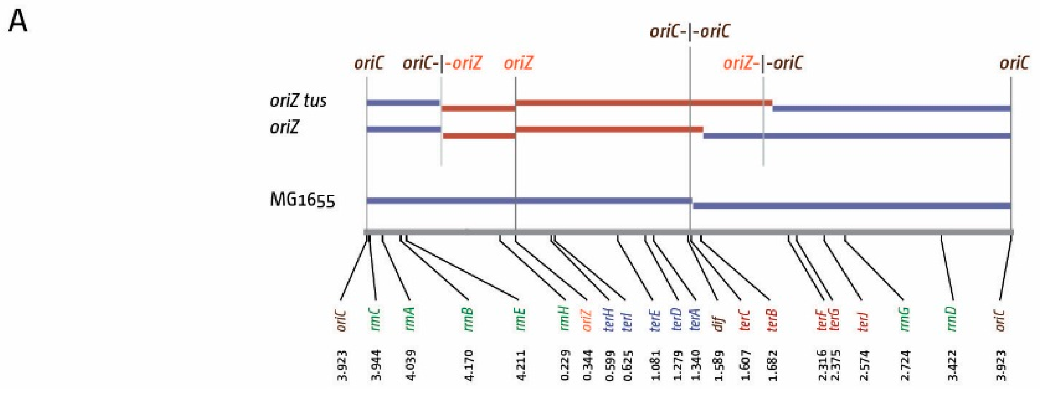 - Wang, X.; Lesterlin, C.; Reyes-Lamothe, R.; Ball, G.; Sherratt, D.J. Replication and segregation of an Escherichia coli chromosome with two replication origins. Proc. Natl. Acad. Sci. USA 2011, 108, E243–E250. [Google Scholar] [CrossRef] [PubMed]