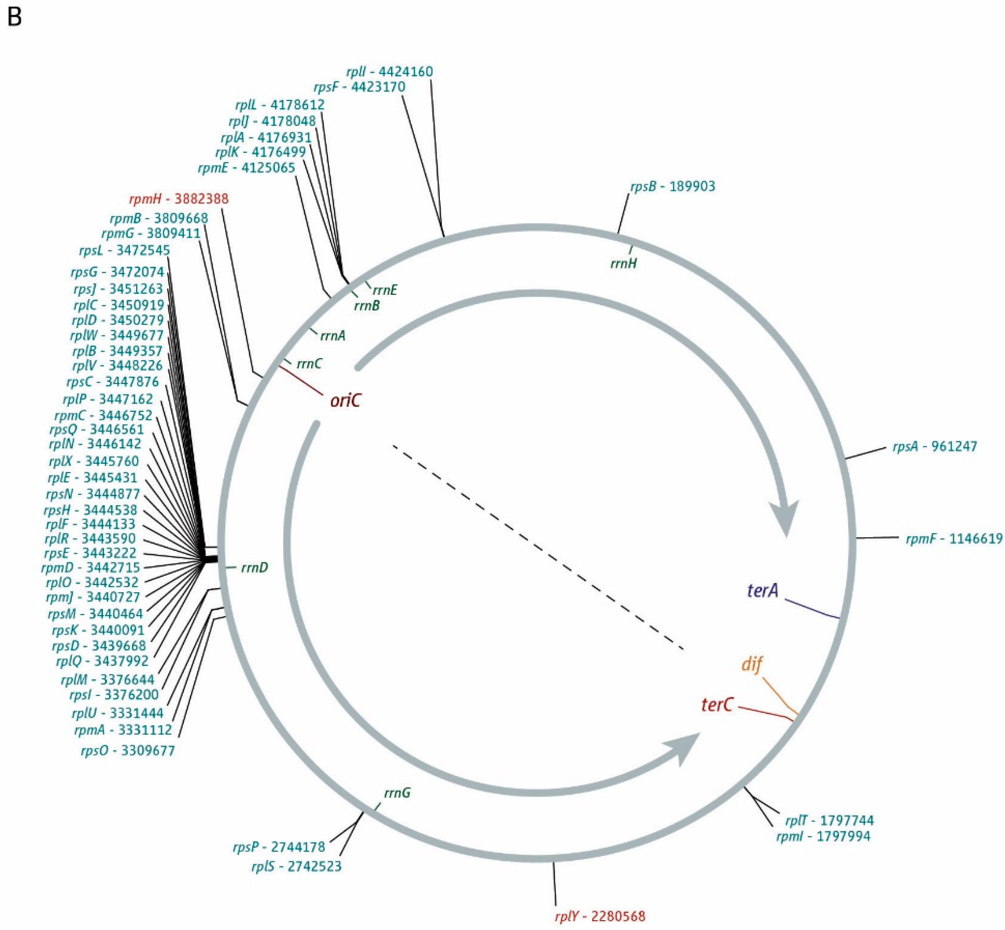 The strongest deviations of the replication profiles were consistently observed at the rrn operons [10,13,46,47,48]. However, all rrn operons are relatively close to oriC. For DNA synthesis escaping the termination area to even reach rrnG, the most origin-distal rrn operon, forks would have to replicate more than 1 Mbp (Figure 1), which would be a rare event. But rrn operons are not the only highly-transcribed genes. We therefore analysed the location and orientation of a number of genes that will be highly transcribed under fast growth conditions. The orientation of transcription of all genes encoding for ribosomal proteins (Figure 3B) is highly biased towards being co-directional with replication (100% in the right-hand replichore and 95% in the left-hand replichore). However, similarly to rrn operons, the majority of these genes are located close to oriC, with 62% forming a tight cluster located between 3.31 and 3.47 Mbp of the chromosome, relatively close to oriC, while only 15% are located in the terminus half of the chromosome.