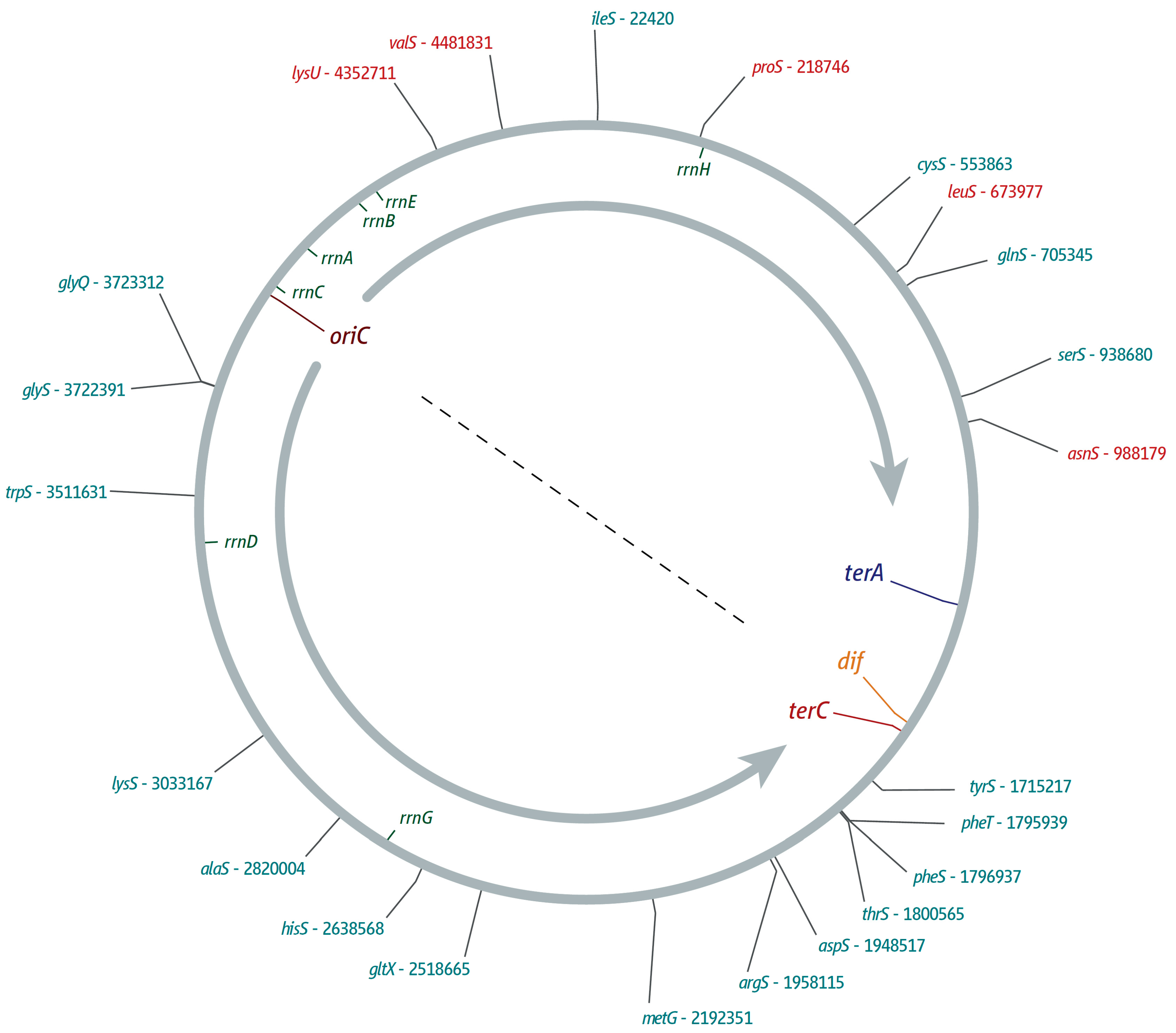 Location and orientation of genes coding for aminocyl tRNA synthetases within the E. coli chromosome. oriC, the innermost ter sites, and the dif chromosome resolution site as well as locations of rrn operons A–E, G, and H are indicated. Orientation of replication within a replichore is indicated by a grey arrow. Locations of genes encoding aminoacyl tRNA synthetases are indicated on the outside. Genes transcribed co-directionally with replication are shown in cyan, genes transcribed in head-on orientation relative to replication in the replichore are shown in red.