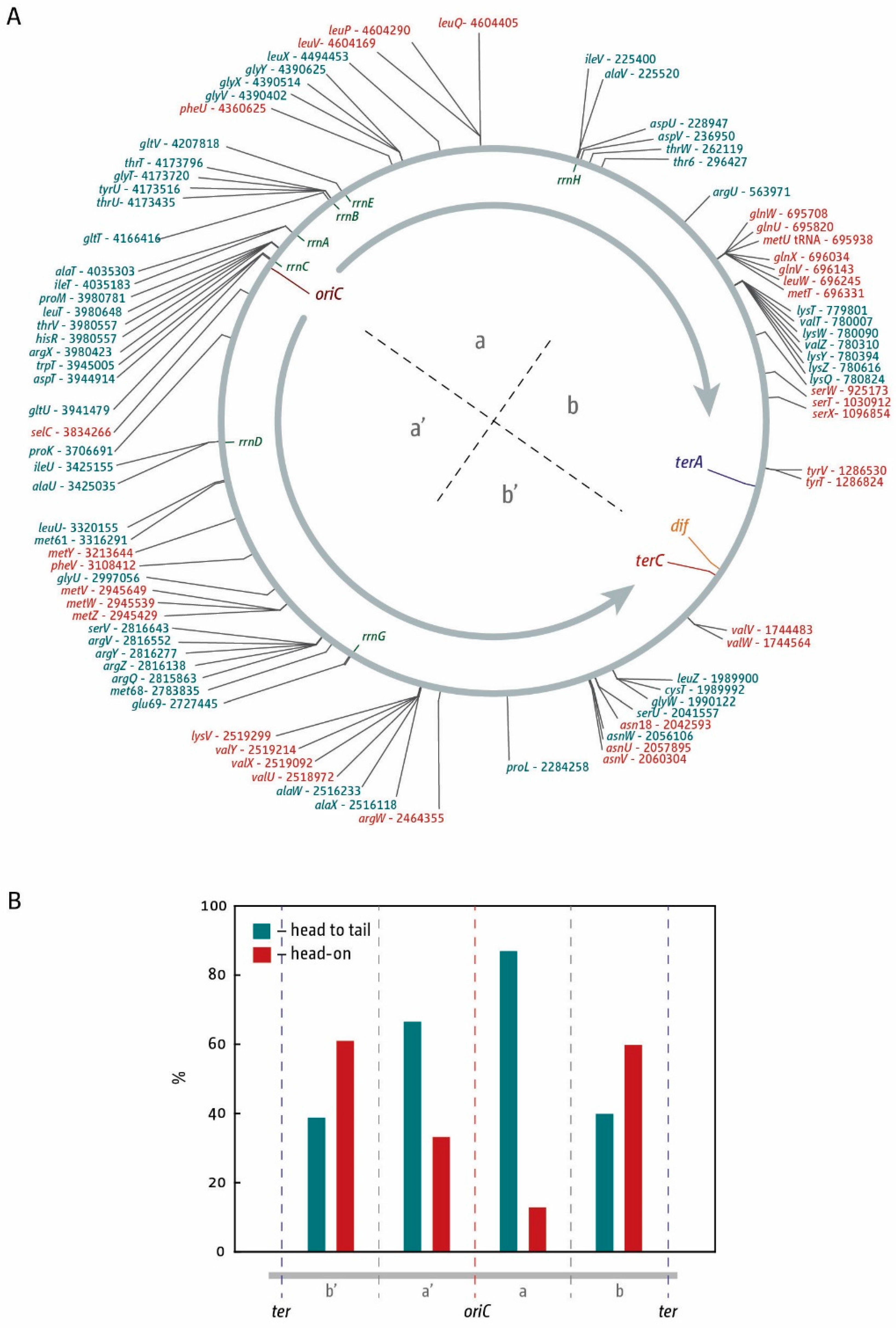 (A) Location and orientation of genes coding for tRNAs within the E. coli chromosome. oriC, the innermost ter sites, and the dif chromosome resolution dimer site as well as locations of rrn operons A–E, G, and H are indicated. Orientation of replication within a replichore is indicated by a grey arrow. Locations of tRNA genes are shown on the outside. Genes transcribed co-directionally with replication are shown in cyan, genes transcribed in head-on orientation relative to replication in the replichore are shown in red; (B) Frequency of head-on (red) and head to tail (cyan) orientation relative to DNA replication of tRNA genes per chromosomal quarters. Quarters a and a’ are origin-proximal, as shown in (A), while b and b’ are origin-distal.
