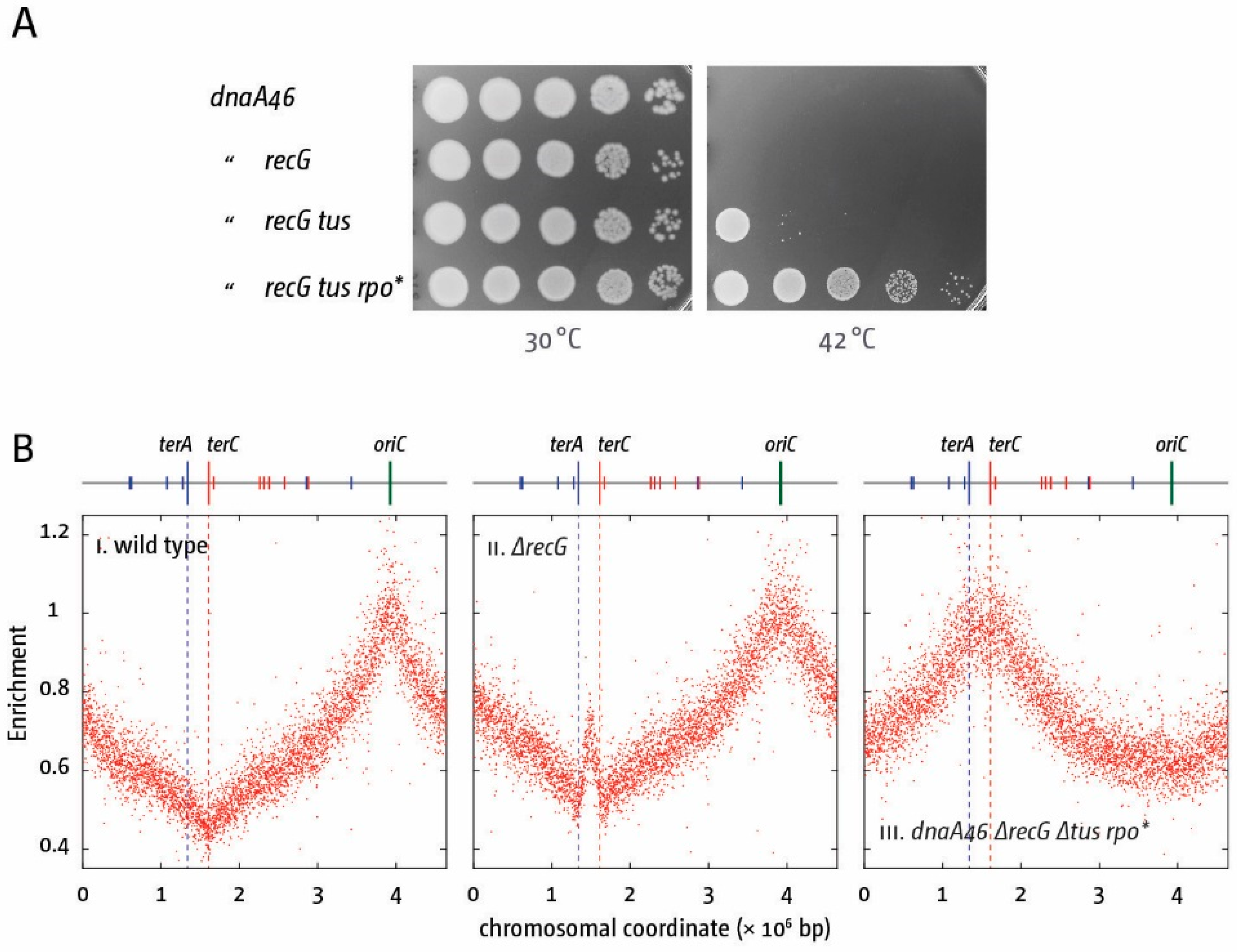 DnaA-independent replication triggered by the absence of RecG can contribute to cell growth if the replication fork trap is inactivated. (A) Spot dilution assay showing the effect of recG, tus and rpoB mutations on growth without DnaA (dnaA46 at 42 °C); (B) Marker frequency analysis of E. coli cells in exponential phase. The number of reads (normalised against the reads for a stationary wild type control) is plotted against the chromosomal location. Positions of oriC (green line) and primary ter sites are shown above the plotted data with red and blue lines representing the left and right replichore as depicted in Figure 1A. Data were re-plotted from [18].