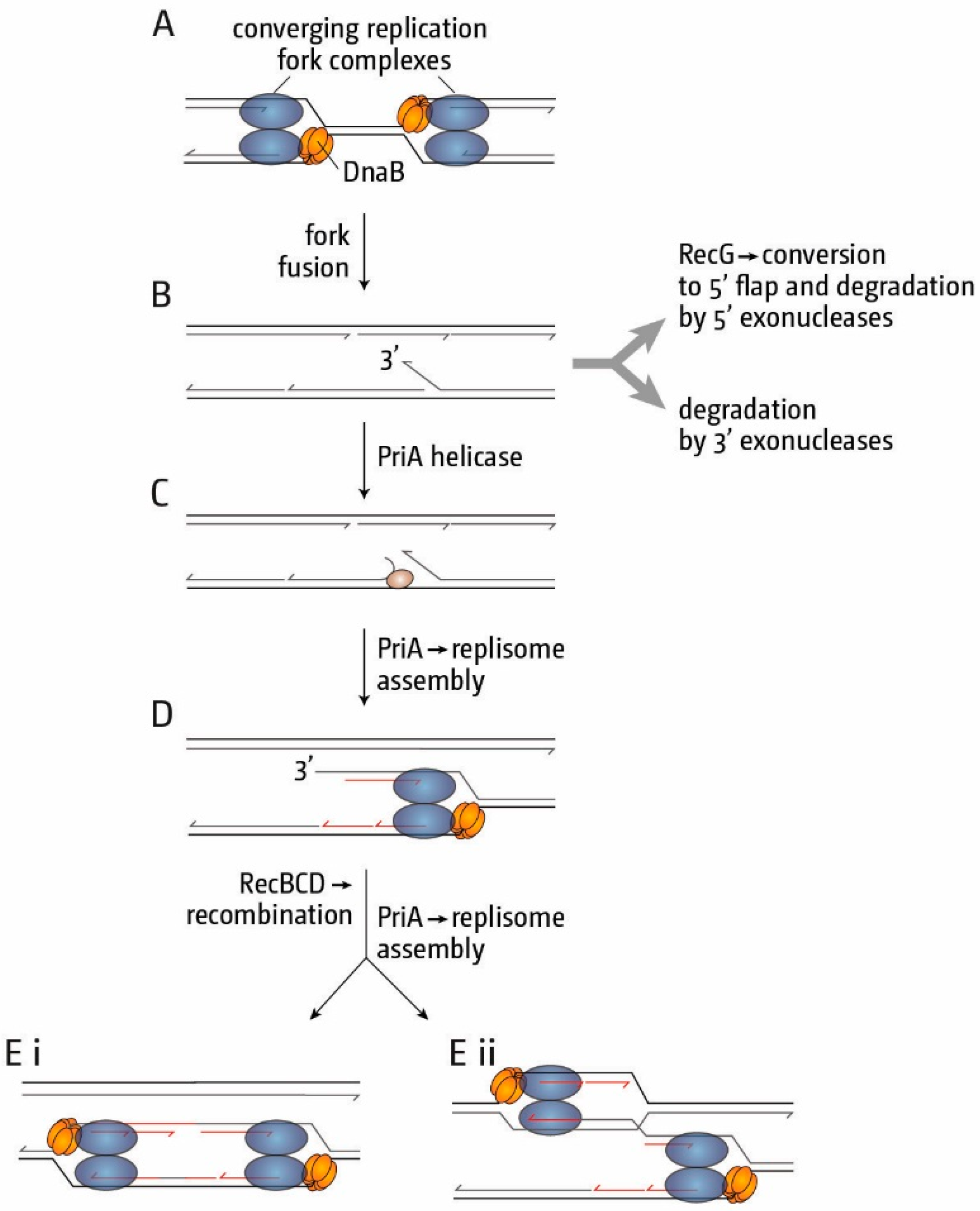 In the absence of either RecG or 3’ exonucleases, a 3’ ssDNA flap will persist for longer and will provide a substrate that PriA could exploit to trigger assembly of a new replication fork (Figure 7C). The affinity of RecG for 3’ flaps is 10-fold higher than that of PriA [92], which explains why over-replication in the presence of RecG (and 3’ exonucleases) is very low [82]. However, if PriA establishes a new fork at a 3’ flap structure, progression of this fork would generate a duplex arm with a free DNA end (Figure 7D), which may then invade the re-replicated DNA behind the fork (or the sister duplex) via the action of RecBCD and RecA recombinases (Figure 7E (i,ii)) [13,14,15,16,17,18]. This in turn would establish a D-loop that could also be targeted by PriA to establish yet another fork moving in the opposite direction. Indeed, we demonstrated that the over-replication observed in recG cells depends on the recombinase activity of RecBCD, and growth of dnaA(ts) recG tus rpo* cells is prevented by the deletion of recB [18], which eliminates the dsDNA exonuclease activity of RecBCD while leaving the recombinase activity intact [94], but not recD [18], which eliminates the exonuclease activity [94]. The newly established forks would be blocked by the ter/Tus traps as they proceed towards oriC, explaining why over-replication is tightly restricted to the termination area. The idea of accumulating 3’ flaps is also consistent with the inviability of recG cells lacking three exonucleases each capable of removing a 3’ flap, and the restoration of viability when the helicase activity of PriA required for the observed over-replication is eliminated [17,18].