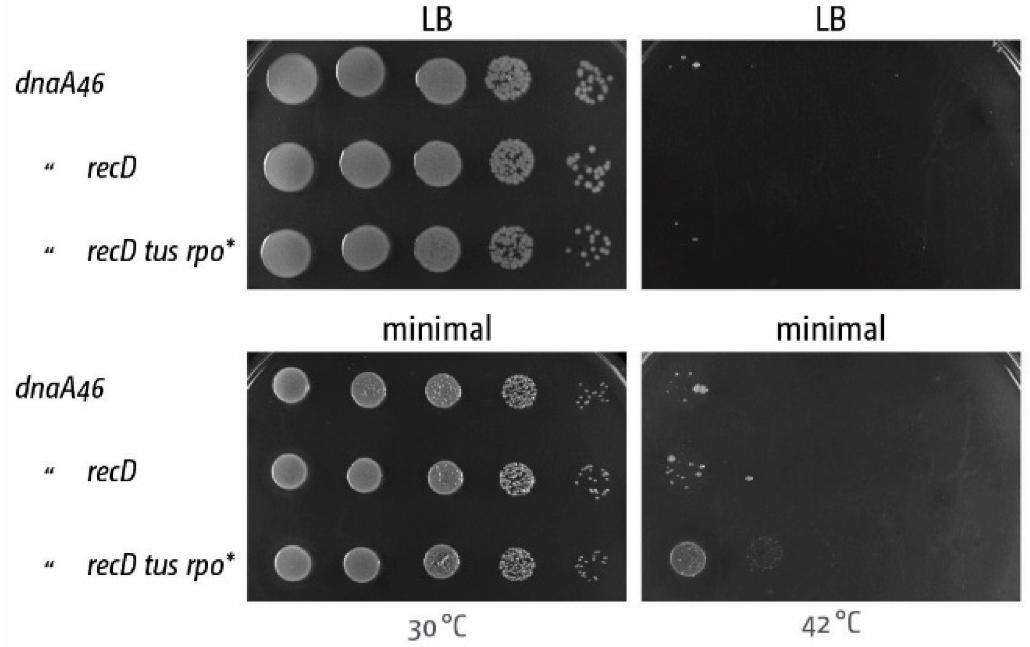 DnaA-independent growth in cells triggered by the absence of RecD contributes very little to cell growth. Spot dilution assay demonstrating that recD contributes little to growth without DnaA (dnaA46 at 42°C) even in the presence of tus and rpo* mutations (compare with the effect observed in the absence of RecG in Figure 6A).