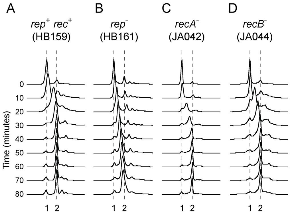 The above data do not address the relative importance of Rep and recombination enzymes in underpinning efficient fork movement. The time taken to replicate chromosomes during a single cell cycle was therefore estimated using flow cytometry in strains lacking either Rep or RecA. Upon synchronising replication initiation using the temperature-sensitive dnaA46 allele, wild type cells take 40–50 min for their DNA content to increase from 1 to 2 chromosome equivalents but Δrep cells take more than 80 min [31] (see also Figure 3A,B). This extended duplication time reflects the impact of nucleoprotein complexes on fork progression in the absence of Rep [22,30]. In contrast to Δrep mutant cells, we found that the majority of recA mutant cells had completed genome duplication after 40–50 min (Figure 3C). We also tested the time taken for chromosome duplication in recB mutant cells. The requirement for either Rep or RecBCD for survival implies that one or the other of these enzymes provides an essential means of underpinning fork progression [71,72]. However, recB mutant cells had chromosome duplication times similar to those found in wild type and recA mutant cells (Figure 3D).