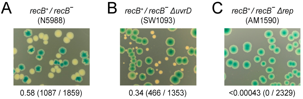 The corollary of Δrep ΔuvrD rpoB*35 recA inviability is that RecBCD is unable to maintain viability without RecA in this context. This requirement for RecA is in contrast to the viability of rep recA double mutant cells versus the inviability of rep recB double mutants in a rpoB+ background [71]. This differential requirement in uvrD+ rep− cells reflects the generation of double-stranded DNA ends by regression of blocked replication forks and the need for RecBCD to process these ends [58]. Processing can occur either by loading of RecA followed by strand exchange or, in the absence of RecA, RecBCD-catalysed degradation of the dsDNA end to regenerate a fork structure [58]. The viability of uvrD recB double mutant strains is less certain. Absence of UvrD-catalysed removal of RecFOR-loaded RecA from blocked forks may lead to an increased need for RecBCD-dependent repair of dsDNA ends [84]. Some reports indicate reduced viability of uvrD recB mutant strains [91] whereas others report inviability [92,93]. We assayed the viability of ΔuvrD recB− rpoB+ cells by analysing their ability to lose pRC7recB. ΔuvrD recB− rpoB+ cells could generate white colonies on rich medium in contrast to Δrep recB− rpoB+ cells (Figure 5, compare B with C). However, the frequency of ΔuvrD recB− rpoB+ white colony formation was lower and white colony sizes much smaller than with uvrD+ recB− rpoB+ cells (Figure 5, compare B with A). Thus, in this strain, background cells can survive without both UvrD and RecBCD but growth is impaired.