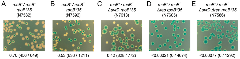 RecB is essential in rep uvrD rpoB*35 cells on rich medium. (A–E) Loss of pAM375 (pRC7recB) from the strains indicated was monitored on LB Xgal IPTG.