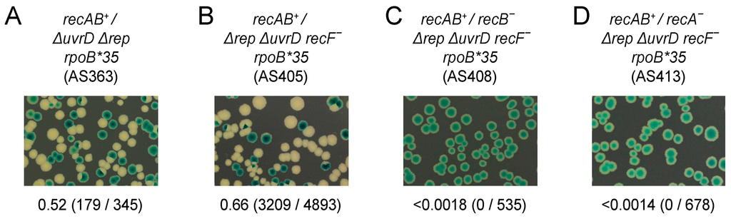 The above data suggest Rep rather than RecA plays the dominant role in ensuring rapid genome duplication. It is clear, though, that transcription is a shared source of replicative defects in cells deficient in either Rep or RecA (Figure 1). However, the viability of rep recA double mutant cells [71] argues against a requirement for either Rep or RecA to overcome transcriptional barriers to replication. Interpretation of rep recA double mutant viability is complicated, though, since UvrD compensates partially for the absence of Rep accessory helicase function [22,30]. The requirement for RecA was tested therefore in the absence of both Rep and UvrD by using a Δrep ΔuvrD double mutant strain rendered viable by the rpoB*35 allele via a reduction in replication-transcription conflicts [22,42,79]. A plasmid loss assay was employed in which retention of a highly unstable complementing plasmid can be monitored by blue/white screening [87]. Δrep ΔuvrD rpoB*35 cells can lose pRC7uvrD on LB as indicated by the formation of white plasmidless colonies [22] (see also Figure 4A). In contrast, Δrep ΔuvrD rpoB*35 recA cells could not lose pRC7uvrD on LB indicating that RecA is essential for viability in a Δrep ΔuvrD rpoB*35 strain under rapid growth conditions (Figure 4, compare B with A). Thus even when transcriptional barriers to replication are reduced by the rpoB*35 allele there remains a requirement for either accessory helicase function or RecA.