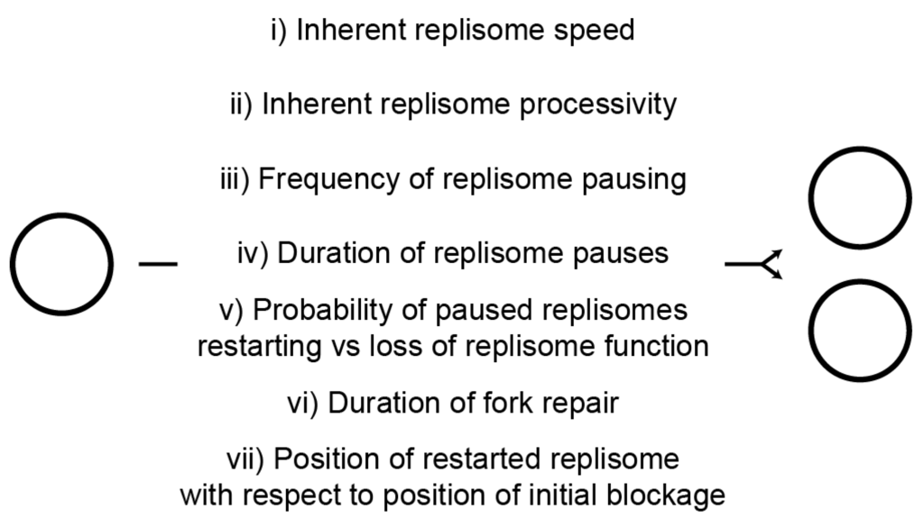 Summary of factors with potential influence on the probability of replisomes completing chromosome duplication and the time needed to do so.