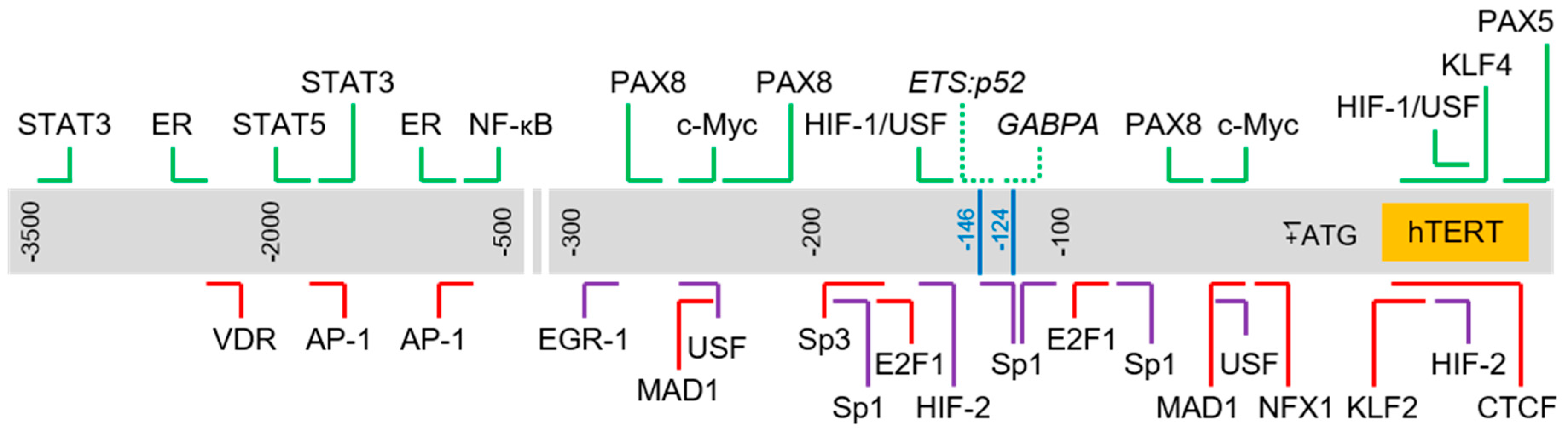 EGR-1 is a transcription factor whose activity is crucial for mitogenesis and cellular differentiation. The effect of this protein on hTERT transcription is two-fold—it can act as an activator and also a repressor depending on the tissue of origin. Ectopic expression of EGR-1 in villous cancer cells led to an increase in hTERT expression, both in the mRNA and protein levels [114]. This effect was shown to be mediated by the direct binding of the protein to a single site in the proximal promoter region of hTERT. Furthermore, expression of EGR-1 was found to correlate with that of hTERT during trophoblastic development and in patients with preeclampsia. On the contrary, the examination of mRNA levels in primary cervical cancer tissues revealed a negative correlation between the expression of EGR-1 and that of hTERT. Further studies involving epidermoid carcinoma and squamous cell carcinoma cell lines supported this observation—overexpression of EGR-1 resulted in the suppression of hTERT expression [115]. These results showcased the important role EGR-1 plays in the regulation of hTERT gene transcription.