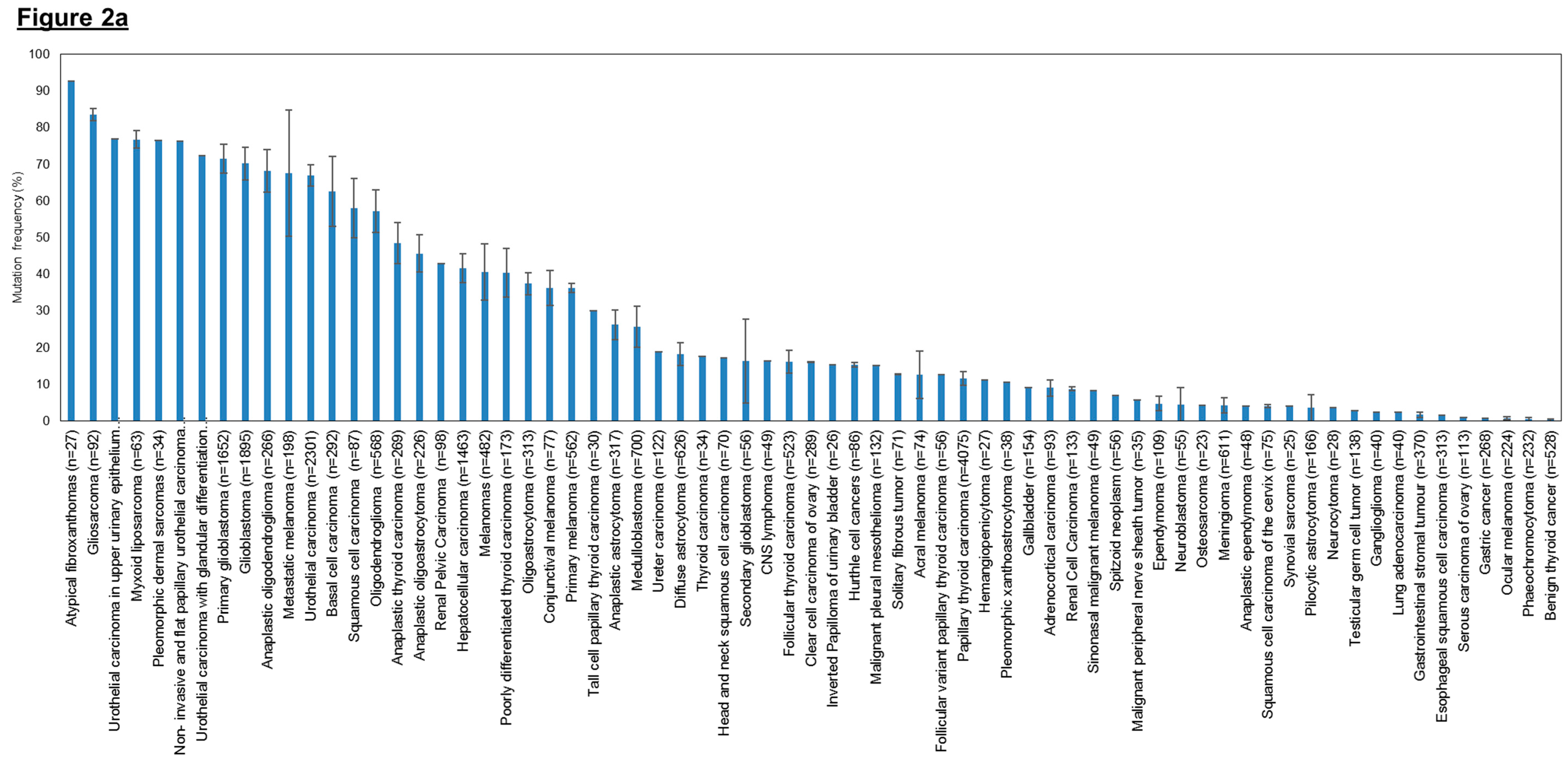 As shown in Figure 2, urothelial carcinoma samples display up to 67% mean mutation frequency (n = 2301) in the hTERT promoter region, specifically at the two hotspots, making it the most frequently mutated gene identified so far in this region. Hence, these hTERT promoter mutations have the potential to become a good biomarker for clinicians to conduct early detection of bladder cancer and subsequent follow-up tests for cancer progression or recurrence in patients. In hepatocellular carcinomas, about 42% mean mutation frequency (n = 1463) in the hTERT promoter region was observed. Similarly, their high prevalence suggests that these hotspot mutations may be utilized as candidate biomarkers for early detection and monitoring. Lastly, the high prevalence of hTERT promoter mutations in various subtypes of gliomas also suggest that the mutations can serve as useful biomarkers to aid in classification and prognostication via extraction of samples from cerebrospinal fluid. Further studies to confirm such a causal relation in various tumor types will be necessary before genome-based clinical classifications based on hTERT promoter mutations can find their way into the clinics.