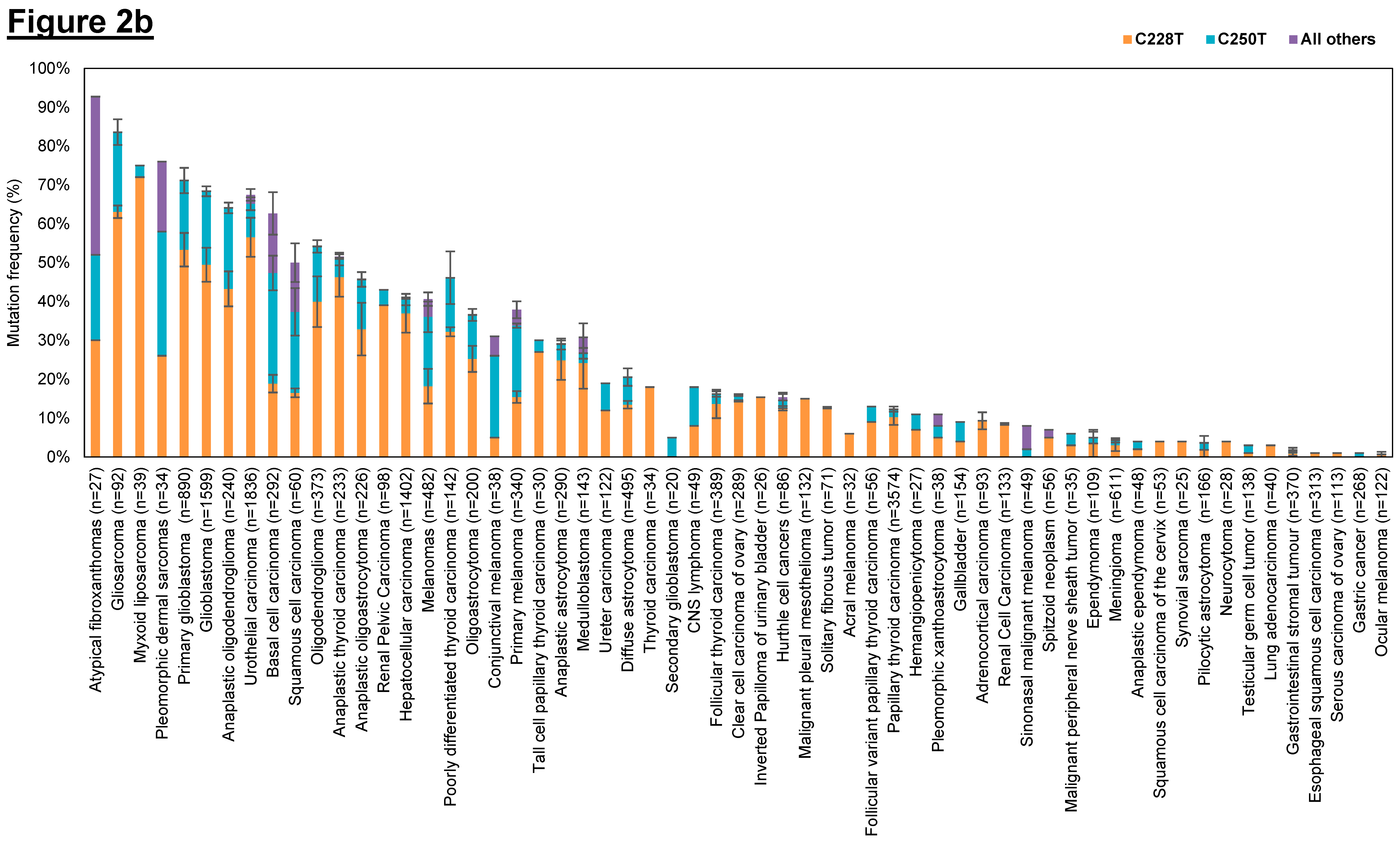 Frequency of human telomerase reverse transcriptase (hTERT) promoter mutations in various cancer types. (a) Overall hTERT promoter mutation frequencies of various cancer types plotted in descending order; (b) Overall hTERT promoter mutation frequencies of various cancer types with breakdown of individual frequencies of C228T, C250T, and all other mutations. The overall mutation frequencies of hTERT promoter were compiled from all relevant publications on human cancer genome sequencing. The label “n” corresponds to the total number of tumors sequenced among different studies for the same tumor type. Error bars correspond to the standard errors in mutation frequencies calculated among different studies on the same tumor type. Only studies with at least 20 samples sequenced were included in this study. Only studies which provided the detailed breakdown of different mutation sites were included in (b). Refer to Table 3 for the list of references used to compile this figure.