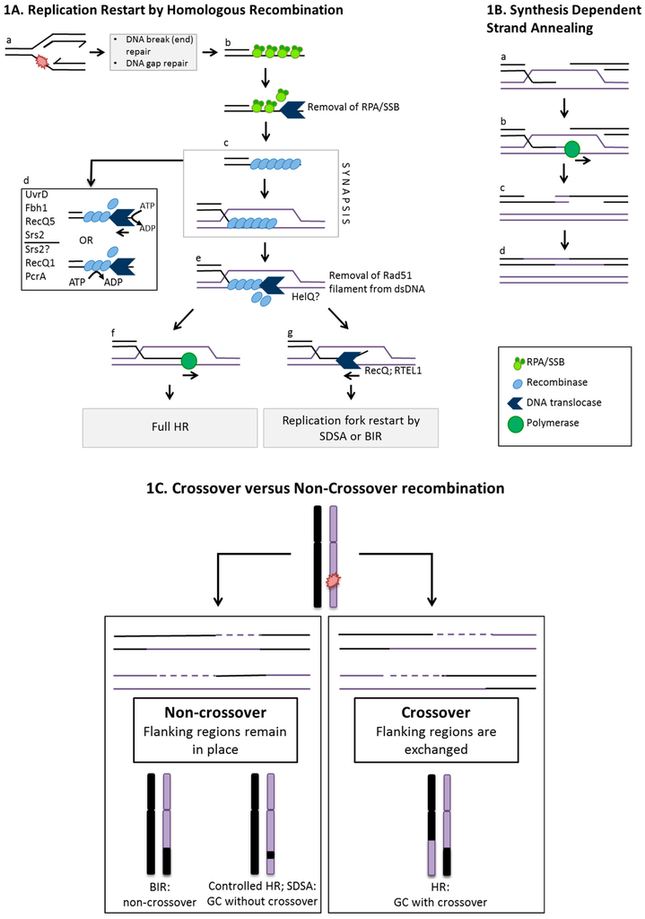 HR initiates from damaged single stranded DNA being invaded into a homologous duplex by a “strand exchange” reaction (“synapsis”) that creates a D-loop (“displacement loop”) intermediate. The D-loop structure is central to restarting DNA replication that preserves DNA sequence information from the homologous template (Figure 1A). HR may be called upon for replication repair in response to chemical damage to DNA if it inhibits replicative polymerase or helicase activities [4], or if nucleoprotein complexes block the combined actions of replicative and accessory helicases at the replisome [5]. Reactivation of blocked or collapsed replication sites remote from replication origins is possible if the fork is stabilized or processed by repair nucleases and helicases into suitable substrates for re-priming replication. Excision repair processes can deal with the DNA strand lesion. Exposure of ssDNA at compromised or collapsed replication forks makes the presence of single-stranded DNA binding proteins, such as single stranded DNA binding protein (SSB) and replication protein A (RPA), important for how repair by HR can proceed at these sites. Here we focus on how and why HR initiated from ssDNA is regulated as part of DNA repair processes.