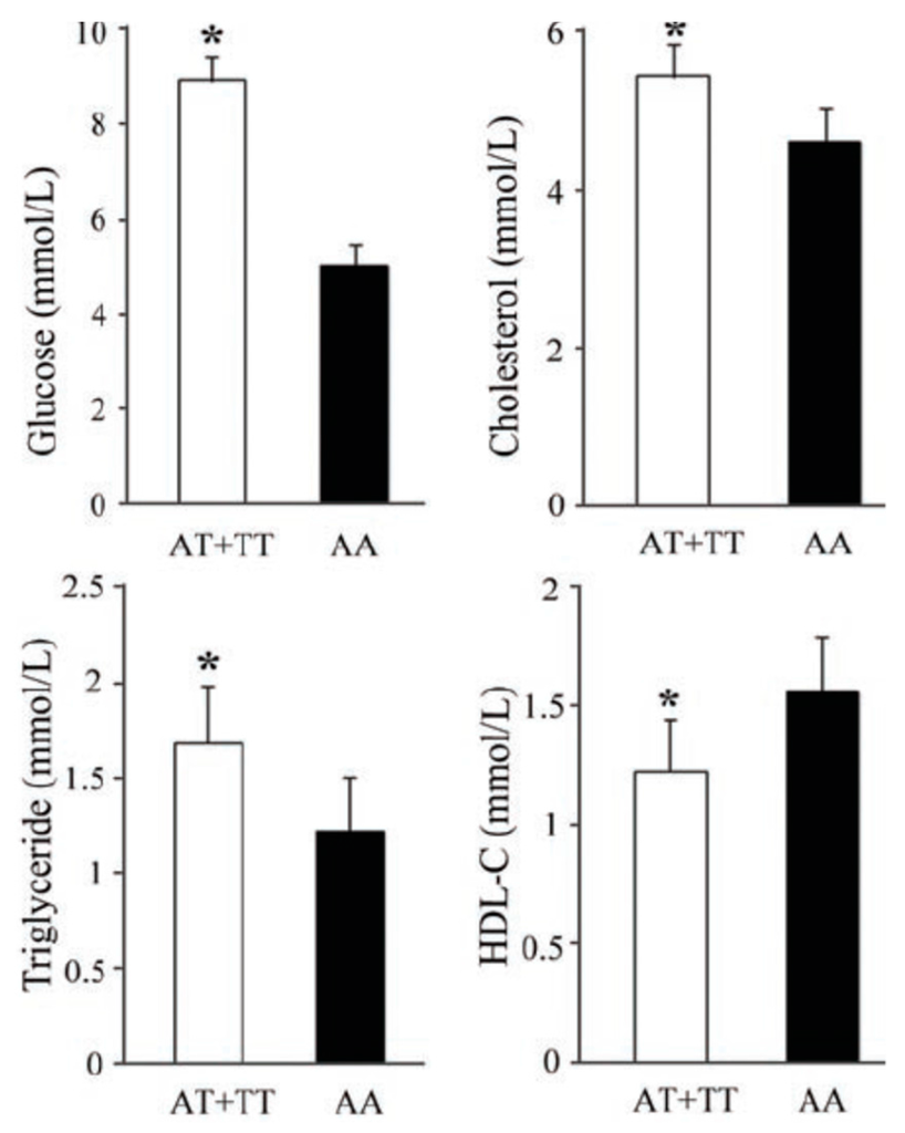 To determine the effects of rs10851685 on clinical characteristics, we further analyzed the associations between the clinical variables and the genotypes of rs10851685 in all participants under a dominant model. As shown in Figure 1, compared to the 510 subjects with AA genotype, the 325 carriers of the risk allele T showed significantly higher concentrations of fasting plasma glucose (8.92 ± 0.54 vs. 5.01 ± 0.47 mmol/L, p < 0.05), cholesterol (5.42 ± 0.42 vs. 4.61 ± 0.44 mmol/L, p < 0.05) and triglyceride (1.68 ± 0.31 vs. 1.22 ± 0.29 mmol/L, p < 0.05), and lower HDL-C concentration (1.23 ± 0.22 vs. 1.56 ± 0.24 mmol/L, p < 0.05).