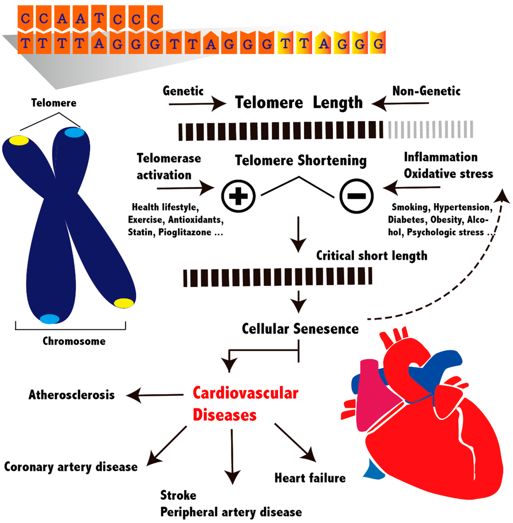 Several epidemiologic surveys have reported an association of short telomere length (TL) with CVD [3,4,5,6] and cardiovascular mortality [7,8]. For instance, the Cardiovascular Health Study reported that each shortened kilobase pair of TL corresponded to a threefold increased risk of MI and stroke [3]. A recent systematic review and meta-analysis reported a constant positive association of decreased leukocyte TL (LTL) with cardiometabolic outcomes, where one standard deviation (SD) decrease in LTL was significantly associated with a 21%, 24%, and 37% increased risk of stroke, MI, and type 2 diabetes mellitus, respectively [5]. In this review, we discuss and review the current knowledge of the role of telomeres in CVDs.