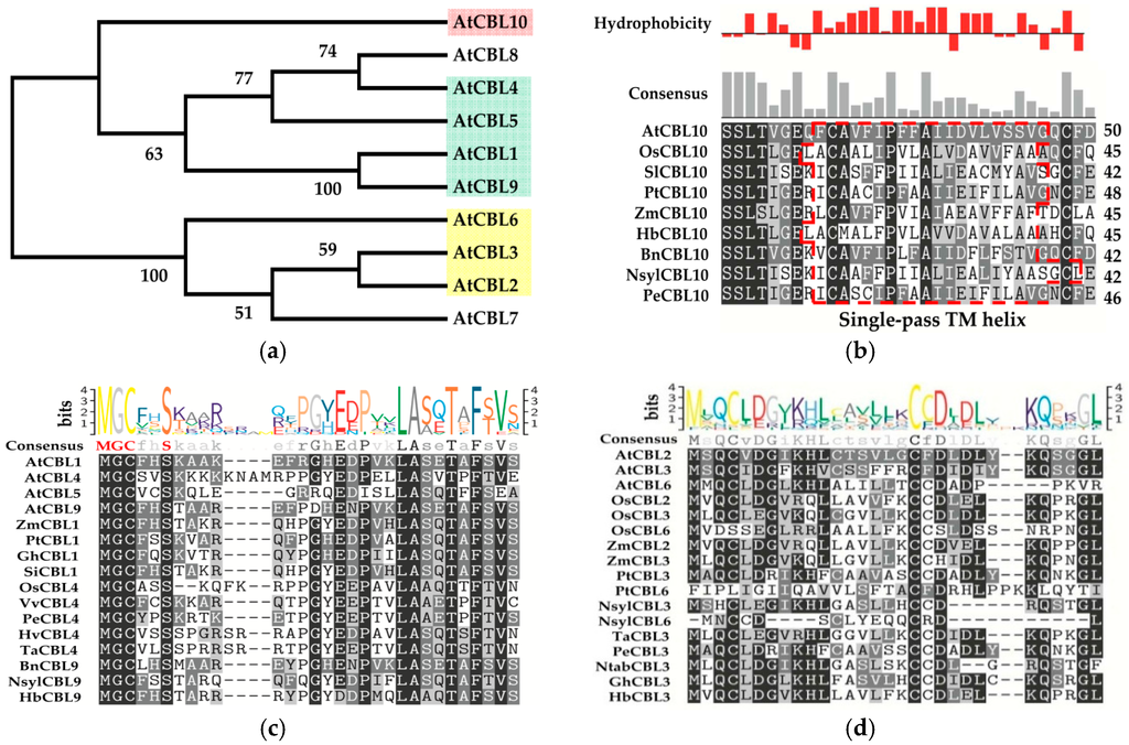Classification and motifs display of CBLs. (a) Phylogenetic relationship of CBL proteins in Arabidopsis thaliana. The protein harboring signal-pass transmembrane (TM) helix motif, dual lipid modification MGCXXS/T motif and tonoplast targeting sequence (TTS) is marked in pink, green and yellow shades, respectively; (b) Detailed sequence comparisons of the single-pass TM helix of CBL10s from different plants; (c) Detailed sequence comparisons of the MGCXXS/T motif of CBL1, 4, 5 and 9 proteins; (d) Detailed comparisons of the TTS of CBL2, 3 and 6 proteins. Note: The amino acid sequences are available from UniProt (www.uniprot.org/) and we added some other CBL protein sequences from other organisms for better display. Phylogenetic tree is constructed by MEGA6 with Neighbor-Joining method. Multiple sequence alignment is provided by BoxShade (www.ch.embnet.org/software/BOX_form.html). Hydrophobicity and Consensus are indicated by Texshade. Single-pass TM helix is predicted by HMMTOP (www.enzim.hu/hmmtop/). Codification: At, Arabidopsis thalians; Bn, Brassica napus; Gh, Gossypium hirsutum; Hb, Hordeum brevisubulatum; Hv, Hordeum vulgare; Nsyl, Nicotiana sylvestris; Ntab, Nicotiana tabacum; Os, Oryza sativa; Pe, Populous euphratica; Pt, Populus trichocarpa; Ta, Triticum aestivum; Si, Setaria italica; Sl, Solanum lycopersicum; Vv, Vitis vinifera; Zm, Zea mays.