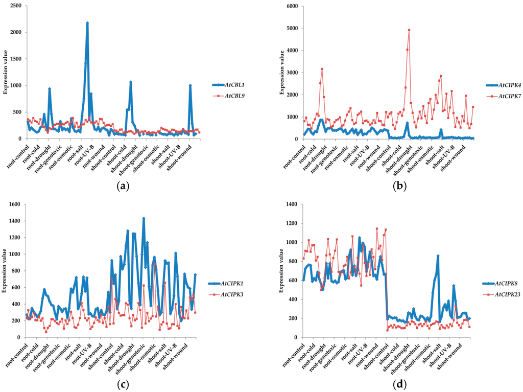 It is important to note that, although homologous genes are used to be considered to be functionally identical, calcium sensors with high sequence similarities may perform very distinct functions and paralogous genes usually evolve some new functions [40]. There are some paralogous genes in CBL-CIPK network, including CBL1/9, CBL2/3, CIPK1/17, CIPK2/10, CIPK4/7, CIPK5/25, CIPK12/19 and CIPK13/18 (Figure 2a and Figure 3). Expression data from The Arabipsis Information Resource (TAIR) database showed that there are limited correlations between the expression patterns of CBL1 and CBL9 (r = 0.11049, p = 0.2885, r and p represent relativity and probability, respectively), CIPK4 and CIPK7 (r = −0.04698, p = 0.6512) under some abiotic stresses (Figure 4a,b) [41]. There are also some experimental proofs indicating that CBL1 has distinctively different functions from CBL9 in drought and ABA responses [40,42,43]. Meanwhile, genes with a closer evolutionary relationship may have similar functions and work cooperatively to adapt to the complex and changeable environment. There are strong correlations between the expression patterns of CIPK1 and CIPK3 (r = 0.86272, p < 0.0001), CIPK8 and CIPK23 (r = 0.57839, p < 0.0001) in intron-rich clade (Figure 4c,d), CIPK7 and CIPK12 (r = 0.68713, p < 0.0001) in intron-less clade (Figure 4e).