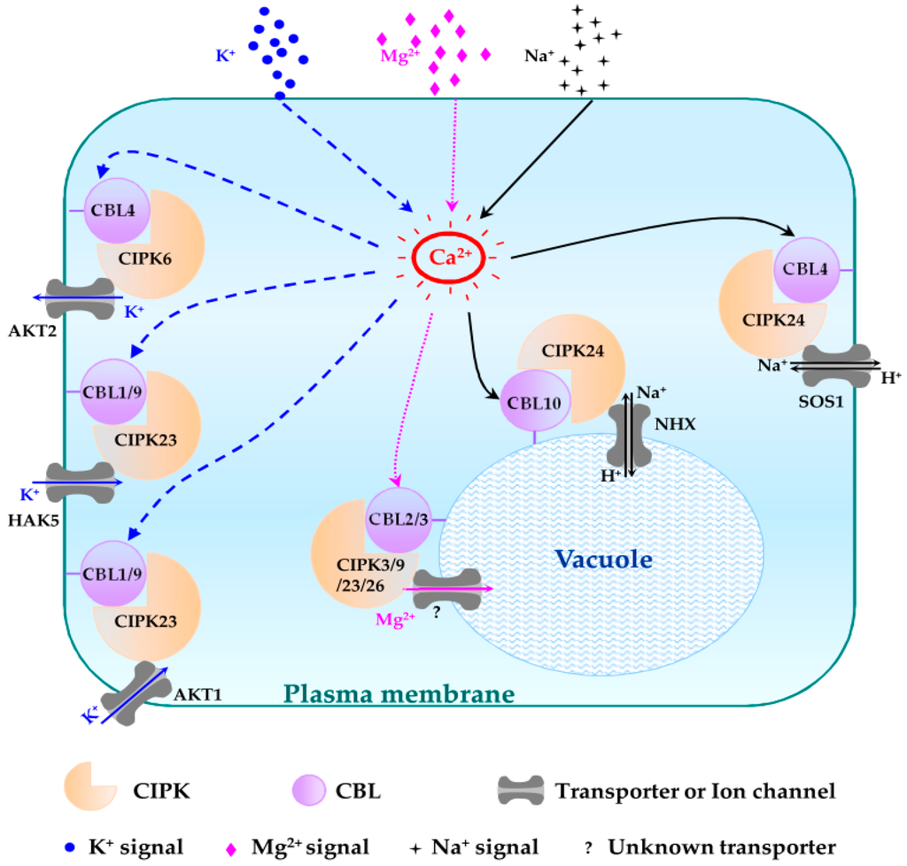 Schematic representation of different CBL-CIPK complexes and their functions in regulating sodium (Na+), potassium (K+) and magnesium (Mg2+) homeostasis. The regulatory pathways of K+, Mg2+ and Na+ are indicated in blue, pink and black lines, respectively. Question mark (?) indicates an unknown tonoplast-localized transporter.