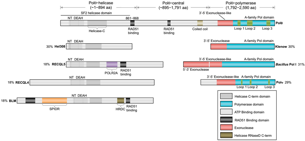 The overall organization of Polθ encoding genes are relatively conserved among metazoans and include an A-family polymerase domain at the C-terminus and a superfamily 2 (SF2) Hel308-type helicase domain at the N-terminus. A schematic of human POLQ is illustrated in Figure 1. Although this type of helicase-polymerase gene fusion is unique to higher eukaryotes, multifunctional helicase-polymerase proteins have previously been identified in bacteria, archaea and viruses, and typically function in replication initiation as well as DNA repair and DNA damage tolerance []. Polθ encoding genes also contain a large central portion linking the helicase and polymerase domains (Figure 1). The central domain exhibits the lowest amount of sequence homology and has yet to be ascribed a specific activity or regulatory function. On the other hand, the polymerase and helicase domains exhibit relatively high sequence homology, indicating that they share common functions among different organisms.