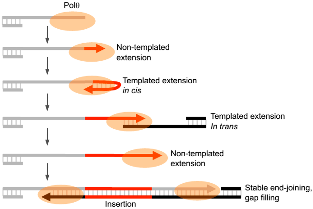 The first evidence supporting a role for Polθ in the alt-EJ pathway was revealed by studies in Drosophila melanogaster. Chan et al. demonstrated that a form of alt-EJ that functions independently of HR and the essential NHEJ factor Ligase 4 (Lig4) is promoted by the mus308 gene which encodes Polθ []. Importantly, these Polθ-mediated DNA repair products resulted in relatively large indels. The insertion and deletion lengths respectively decreased and increased in cells harboring a mus308 mutation that significantly reduces overall levels of the polymerase. The observed insertions often included short sequence tracts that were similar or identical to flanking DNA regions, or appeared as a random sequence. These data therefore hinted at the ability of Polθ to potentially extend 3’ ssDNA overhangs by both template-dependent and template-independent mechanisms during alt-EJ.