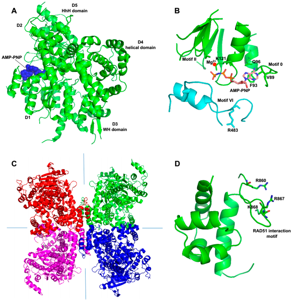 Structure of the Polθ helicase domain. (A) Crystal structure of Polθ-helicase (PDB code 5AGA). The location of helicase domains D1–D5 and AMP-PNP are indicated. (B) Close up structure of the conserved nucleotide binding domain in complex with AMP-PNP (PDB code 5AGA). (C) Structure of the tetrameric form of Polθ-helicase. Individual Polθ-helicase monomers are represented in blue, green, red and cyan (PDB code 5A9J). Symmetry axis is indicated as blue lines. (D) Close up structure of the RAD51 binding site (residues 861–868) (PDB code 5A9J).