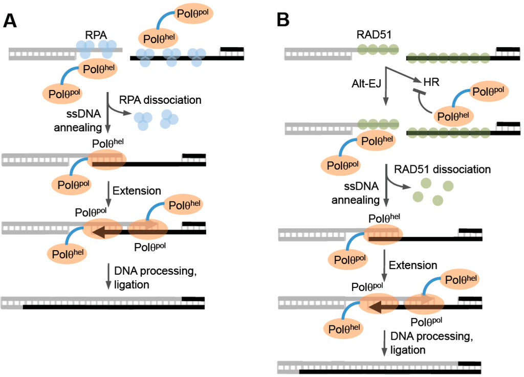 Models of Polθ-helicase activity during end-joining. (A) Model of end-joining involving Polθ-helicase ssDNA annealing activity. Polθ-helicase may interact with RPA and promote ssDNA annealing at microhomologous regions which is likely to facilitate end-joining. After annealing and DNA synapse formation, the polymerase domain performs ssDNA extension by utilizing the opposing overhang as a template in trans. (B) Model of end-joining involving Polθ-helicase anti-recombinase activity. Alt-EJ and HR share the same resection mechanism and therefore compete during S and G2 cell-cycle phases. Polθ-helicase may dissociate RAD51 filaments, then perform annealing which would enable Polθ-polymerase extension and subsequent steps of end-joining.