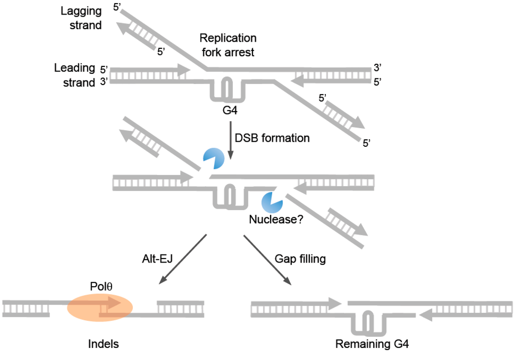 Model of Polθ-mediated end-joining of arrested replication forks. Model of Polθ-mediated end-joining of replication forks arrested at a G-quadruplex (G4). Following the arrest of divergent replication forks at G4, nucleases may cleave the lagging strands which would generate DSBs with 3’ ssDNA overhangs. Polθ may then promote DSB repair via alt-EJ (left). Gap filling on the leading strands may leave the G4 intact (right).