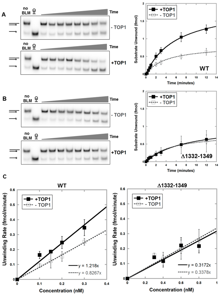 Recombinant BLM proteins were generated and their specific activity evaluated in vitro to confirm that BLM amino acids 1332–1349 are required for functional interaction with TOP1 (Figure 2). BLM wild-type (WT), BLM-Δ1332–1349 and TOP1 were expressed using yeast and purified (Figure S1). Helicase activity of purified BLM proteins was measured using 32P-labeled double-stranded DNA (dsDNA) substrate with a 13-base 3′ single-strand overhang. Initial unwinding rates for four protein concentrations were graphed to calculate the specific activities of the proteins, expressed in fmol substrate unwound/min/nM protein. BLM-Δ1332–1349 unwound dsDNA with a lower specific activity than BLM-WT (Figure S2, 1.5 vs. 2.9). Our previous studies demonstrated that TOP1 stimulates BLM unwinding of R loop-like GC-rich RNA:DNA substrates in vitro [35,36]. To determine if amino acids 1332–1349 are required for this stimulation, we measured unwinding activity of BLM-WT and BLM-Δ1332–1349 on RNA:DNA substrates with and without a two-fold molar excess of TOP1. The effect of TOP1 was measured at four different BLM protein concentrations based on the activity of each protein. Consistent with previous studies, BLM-WT was stimulated 1.5-fold with TOP1 (Figure 2A,C and Figure S3) [36]. However, BLM-Δ1332–1349 was not stimulated by TOP1 at any protein concentration (Figure 2B,C and Figure S4). To verify that the loss of stimulation of BLM-Δ1332–1349 is specific to TOP1, we tested the ability of TOP2A to stimulate BLM helicase activity. We previously demonstrated that TOP2A stimulates BLM unwinding of dsDNA and interacts with the N-terminus of BLM (amino acids 489–587) [44] BLM-Δ1332–1349 unwinding of dsDNA substrate was stimulated approximately 3-fold by TOP2A, similarly to BLM-WT (Figure S5). Our results are consistent with a requirement for amino acids 1332–1349 to facilitate a functional interaction of BLM and TOP1 in unwinding RNA:DNA duplexes.