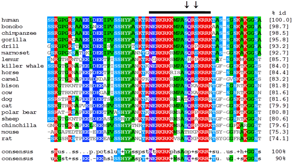 Therefore, a multiple alignment of the NLS and its flanking regions was compiled to assess conservation of the amino acids within the TOP1-interaction region (Figure 3). Analyses demonstrate that the arginine- and lysine-rich bipartite motifs are completely conserved among 19 selected mammalian species. Although there is more variability in the composition of the other residues, all of the included species contain one (drill, mouse, cow) to three (horse) serines in this region. The dog and mouse sequences are notable in that each possesses a single threonine residue that aligns with an otherwise completely conserved serine (human BLM S1342). It is known that physiological functions of BLM are regulated by phosphorylation by several serine/threonine kinases [61]. The BLM 1332–1349 region was thus analyzed with multiple programs in silico to identify potential phosphorylation sites. NetPhos2.0 identified S1342 and S1345 as putative phosphorylation sites with high probability (score of 0.98); accessibility of this region to solvent was confirmed using SABLE. Multiple programs predict that PKC or the DNA damage-sensitive kinases ATM and ATR are highly likely to phosphorylate these residues. Given that this region is highly conserved among mammalian BLM proteins, these analyses suggest that additional functions of the NLS in facilitating protein-protein interactions are likely to be conserved (Figure 3). In the aligned region shown, the NLS sequences contain 1–3 serine residues that are putative targets for post-translational modification by cellular kinases, including ATM, PKA and AKT1, suggesting that these sites could control rDNA stability as well as cellular growth.