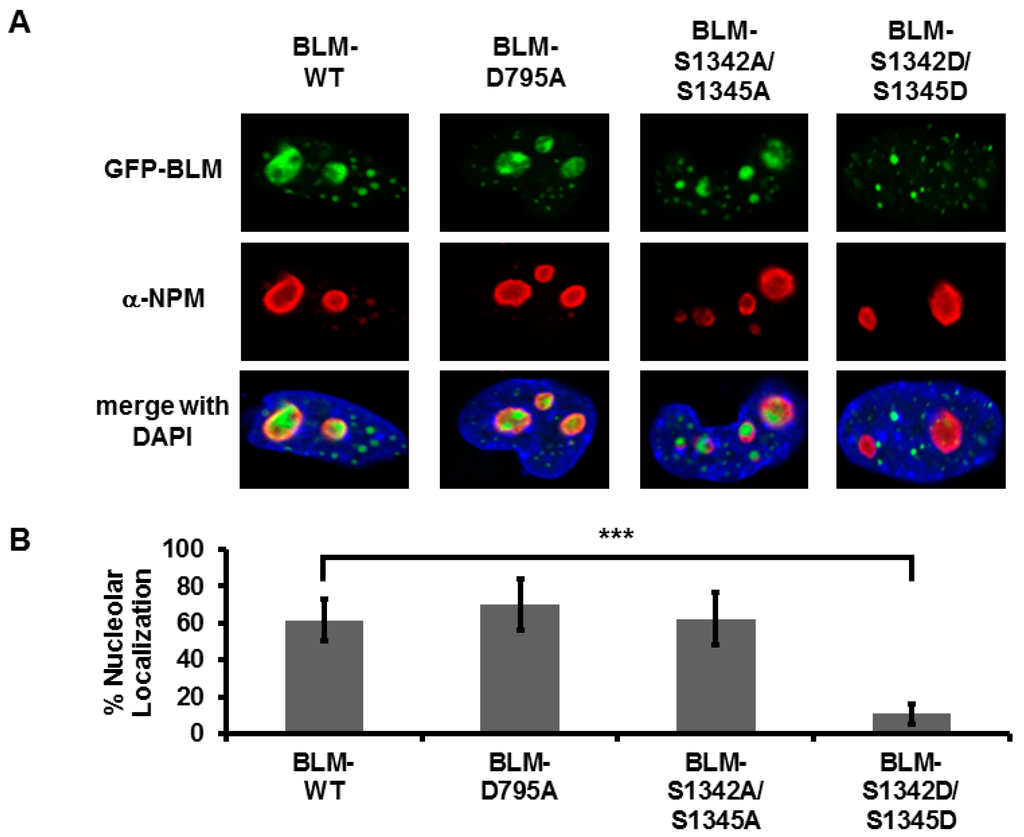 S1342 and S1345 determine nucleolar localization of BLM. (A) Cellular localization of BLM phospho-dead (BLM-S1342A/S1345A) and phospho-mimetic (BLM-S1342D/S1345D) mutants. GM08505 BLM−/− cells were plated on sterile coverslips and transfected with the indicated GFP-tagged BLM plasmids, BLM-WT, BLM-D795A (helicase dead), BLM-S1342A/S1345A and BLM-S1342D/S1345D, using Lipofectamine 2000. Cells were fixed with 4% paraformaldehyde 24-h post-transfection, permeabilized with 0.25% Triton-X-100 and blocked with 10% normal goat serum. Nucleoli were stained with anti-nucleophosmin (α-NPM) and Alexa-Fluor fluorescent secondary antibodies and coverslips were mounted with VectaShield plus DAPI mounting medium. (B) Quantification of nucleolar localization. Nucleolar localization for 100 cells from 4 to 5 blinded experiments was expressed as percent nucleolar localization. Error bars depict standard deviation. Results were compared to BLM-WT using a Student’s t-test (*** p < 0.0001).