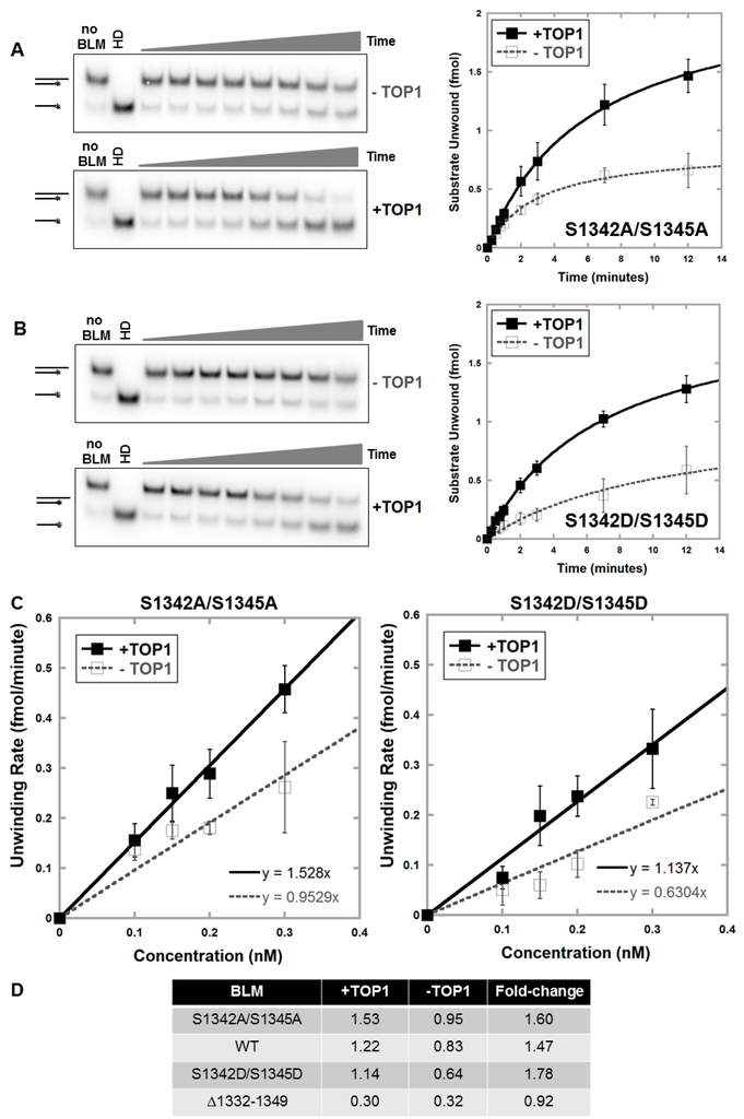 Unwinding of RNA:DNA substrate by BLM-S1342A/S1345A or BLM-S1342D/S1345D is equally stimulated by TOP1. Kinetics of unwinding of RNA:DNA substrate were assessed using a range of BLM protein concentrations with and without TOP1. Representative gels and kinetics of unwinding for one representative protein concentration, 0.2 nM, by BLM-S1342A/S1345A (A) or BLM-S1342D/S1345D (B) are shown. BLM protein with two-fold molar excess of TOP1 or equivalent volume of reaction buffer was incubated with 2 fmol RNA:DNA substrate for 0.25, 0.5, 0.75, 1, 2, 3, 7 and 12 min at 37 °C; double- and single-stranded products were separated on non-denaturing acrylamide gels. Heat denatured (HD) substrate was generated by heating at 95 °C for 5 min. Unwinding was quantified as the amount of single-stranded substrate compared to the total substrate per time-point. Experiments were repeated 3 to 6 times for each protein concentration, and curves showing amount of substrate unwound (fmol) as a function of time were fitted to hyperbolic plots corresponding to the Michaelis-Menten equation. BLM-WT was used as a positive control for the ability of TOP1 to stimulate BLM (Figure 2). Reactions with TOP1 alone were performed with each experiment to verify the lack of unwinding ability of TOP1. Error bars depict standard deviation. (C) Specific activities of BLM proteins with and without TOP1 were calculated by measuring initial unwinding rates for 4 protein concentrations (as in panels A and B; Figures S9 and S10) and graphed as a function of protein concentration; specific activity was calculated from the slope of the line (fmol substrate unwound/min/nM protein) (Figures S7 and S8). Error bars depict standard deviation. (D) Table showing the fold-change of RNA:DNA unwinding activity of each BLM protein with TOP1. Specific activities shown (fmol/min/nM) were obtained as in panel C and Figure 2C.