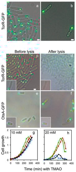 Misfolded or overexpressed fusion proteins frequently form inclusion bodies and aggregate at the poles due to nucleoid occlusion from the middle of the cells [,]. Inclusion bodies are insoluble protein aggregates which remain aggregated upon cell lysis []. To rule out the possibility that the TorR focus represents inclusion bodies, live W3110ΔtorR cells expressing TorR-GFP were mounted onto an agarose pad of ABTGcasa medium with lysozyme for cell lysis. As a control, cells expressing OtsA-GFP were included in the experiments since overexpression of OtsA leads to rapid formation of inclusion bodies which remain visible as insoluble aggregates after cell lysis []. The fluorescent protein fusions in the cells before and after lysis were visualized by fluorescence microscopy. As expected, the OtsA-GFP fluorescent inclusion bodies remained visible after the cells had lysed (Figure 1e,f) whereas the fluorescence signal from TorR-GFP completely disappeared as soon as the cells lysed (Figure 1c,d), suggesting that the TorR-GFP foci are soluble. To further confirm that the TorR-GFP focus is not inclusion bodies, we co-transformed the W3110ΔtorR cells with the pTorR-GFP and pIbpA-mCherry plasmids. The pIbpA-mCherry plasmid encodes the IbpA-mCherry fusion under control of the ibpA promoter [] and IbpA-mCherry is a marker for inclusion bodies []. It was found that the TorR-GFP and IbpA-mCherry foci did not overlap (Figure S1a,b). The TorR-GFP foci were found to be soluble while the IbpA-mCherry foci remained visible as inclusion bodies after cell lysis (Figure S1e,f). Also, the co-expressed OtsA-GFP and TorR-mCherry foci were found not to overlap. The foci rather occupied distinct regions of the cell pole (Figure S1c,d). Taken together, the TorR polar focus is a protein structure that is distinct from inclusion bodies.