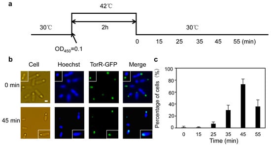 To monitor if TorR interacts with its target genes in a specific period of time during the cell cycle, we synchronized the W3110ΔtorR cells harbouring the plasmid pTorR-GFP, using a dnaC2 mutant. The dnaC2 cells can be synchronized at a stage before initiation of chromosome replication by a temperature shift [,]. Exponentially growing W3110ΔtorRdnaC2 cells carrying pTorR-GFP were shifted from the permissive temperature (30 °C) to the non-permissive temperature (42 °C) (Figure 2a). New initiation of replication was then inhibited, and all cells had only one fully replicated chromosome after 120 min as a result of ongoing replication and cell division (Figure S2a). When the culture was shifted down to the permissive temperature all cells initiated replication from oriC in a synchronous manner. To investigate a possible co-localization of TorR-GFP with the nucleoid the subcellular localization of TorR-GFP focus and the nucleoid were visualized by fluorescence microscopy. Treatment of the cells with lysozyme led to disappearance of TorR-GFP foci, indicating that the TorR-GFP fusion protein in the temperature-shift treatment is soluble (Figure S2b). As shown in Figure 2b, the green focus of TorR-GFP and the blue Hoechst-stained DNA were separated in most of the cells tested at the 0 min time point and they overlapped 45 min after the shift-down to the permissive temperature (Figure 2b). As the cell cycle progressed, the proportion of cells with co-localized TorR-GFP focus and nucleoid increased gradually, from 30% at the 35 min time point to a maximum of 73% at the 45 min time point. At the 55 min time point, the proportion of cells sharply dropped to 36% (Figure 2c). The results indicate that co-localization of TorR and the nucleoid is cell-cycle-dependent, and that co-localization reaches a peak 45 min after the cells are released from initiation-arrest. The generation time at the permissive temperature was about 70 min in the growth condition used. The wild-type E. coli B/r strain has a fixed period of 40 min for replication and a time of 20 min for cell division with a growth-rate-dependent period from cell birth to initiation of replication []. Together, the data and previous findings imply that co-localization of TorR with its target genes occurs after the end of replication, at which TorR may interact with its target genes. The co-localization of TorR and the nucleiod is likely due to chromosome segregation toward cell poles, allowing cell septation.