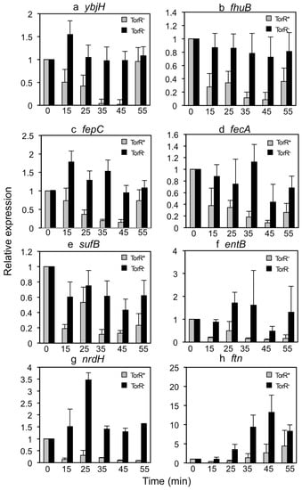 Next, to validate the data obtained from transcriptional array analysis, we performed RT-qPCR. Synchronization of W3110ΔtorRdnaC2 cells containing pTorR-GFP was as described in Figure 2a. RNA isolation and cDNA synthesis were as mentioned above. For analysis of the kinetics of transcription during the cell cycle, eight genes were randomly chosen from 30 genes with changes in expression as a function of the cell cycle in the presence of TorR-GFP. As shown in Figure 3, expressions of five genes (ybjH, fhuB, fepC, fecA and sufB) out of eight tested in the presence of TorR-GFP relative to that at the 0 min gradually decreased up until 45 min and increased sharply at the 55 min time point. The fluctuations in expression of the genes accordingly responded to changes in the number of cells with the co-localized TorR and the nucleoid. The expressions reached the lowest level at the 45 min time point when TorR co-localized with the nucleoid in 73% of cells, and were increased at the 55 min time point when TorR overlapped with the nucleoid only in 36% of cells (Figure 2c and Figure 3a,d). Yet, expressions of the five genes were not clearly oscillating with the progression of cell cycle in the absence of TorR-GFP fusion (Figure 3a–e). Expression of entB and nrdH was repressed in the presence but not in the absence of TorR-GFP, and the repression was not clearly fluctuating during the cell cycle (Figure 3f,g). Interestingly, expression of the ftn gene was gradually increased relative to the 0 min time point in both the presence and absence of TorR-GFP. However, it should be noted that the ftn expression was higher in the absence compared to that in the presence of TorR-GFP (Figure 3h). The result indicates that the ftn gene is regulated by an unknown factor which functions in a cell-cycle-dependent manner with the assistance of TorR. The findings are in accordance with the results from transcriptional microarray analysis, suggesting that the microarray data is reliable and reproducible. The same cell-cycle-dependent fluctuations in expressions of ybjH, fhuB and fepC were found in the dnaC2 mutant but not in ΔtorRdnaC2 cell (Figure S3), the former containing the wild-type chromosomal torR gene. The results again confirm that the TorR-GFP fusion is functional. Together, the results allow us to conclude that TorR regulates the expression of several genes by interacting with its target genes in a cell-cycle-dependent fashion.
