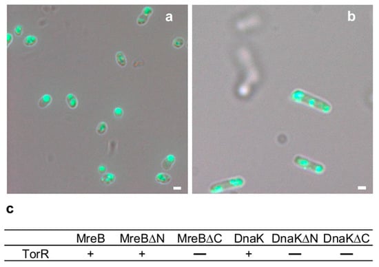 The MreB and DnaK proteins interact with TorR and are required for localization of TorR-GFP at the old poles of cells. (a) Exponentially growing W3110ΔtorR/pTorR-GFP cells in ABTGcasa with IPTG at 37 °C were treated with A22 (10 μg/mL) for 6 h to inhibit MreB, and then fixed in 70% ethanol. The subcellular localization of TorR-GFP was visualized by fluorescence microscopy. The scale bar represents 1 μm; (b) Growth condition and TorR-GFP visualization in exponentially growing W3110ΔdnaK/pTorR-GFP cells were as described in the legend to (a). The scale bar represents 1 μm; (c) BTH101 cells were co-transformed with a mixture of pKNT-torR and pUT-mreB plasmids for testing TorR-MreB interaction, pKNT-torR and pUT-dnaK for TorR-DnaK, pKNT-torR and pUT-mreBΔ2-90 for TorR-MreBΔN, pKNT-torR and pUT-mreBΔ180-281 for TorR-MreBΔC, pKNT-torR and pUT-dnaKΔ1-100 for TorR-DnaKΔN, or pKNT-torR and pUT-dnaKΔ510-639 for TorR-DnaKΔC interaction, plated on LB agar plates containing X-gal, IPTG, and required antibiotics, incubated at 30 °C for 30 h. + stands for protein–protein interaction as shown (blue colonies) in Figure S7—presents no protein–protein interaction as indicated (white colonies).