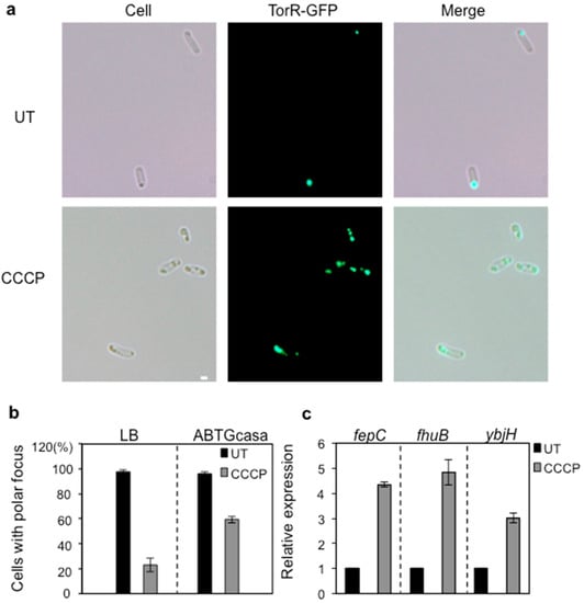 To investigate whether the defect in polar localization of TorR due to CCCP treatment affects transcription of the target genes, we chose the ybjH, fhuB and fepC genes since these genes were shown to be regulated by TorR in a cell-cycle-dependent manner (Figure 3a–c). Transcription of the three genes was measured by RT-qPCR in the synchronized cells grown in ABTGcasa after CCCP treatment. Relative to the expression level of the fepC, fhuB or ybjH gene in cells untreated with CCCP, the expression was increased in cells treated with the drug. In particular, expression of the fhuB gene was increased by about five-fold in the cells treated with CCCP (Figure 5c). The results suggest that ATP is required for delivering the TorR protein to the cell pole and for subsequent regulation of gene expression.